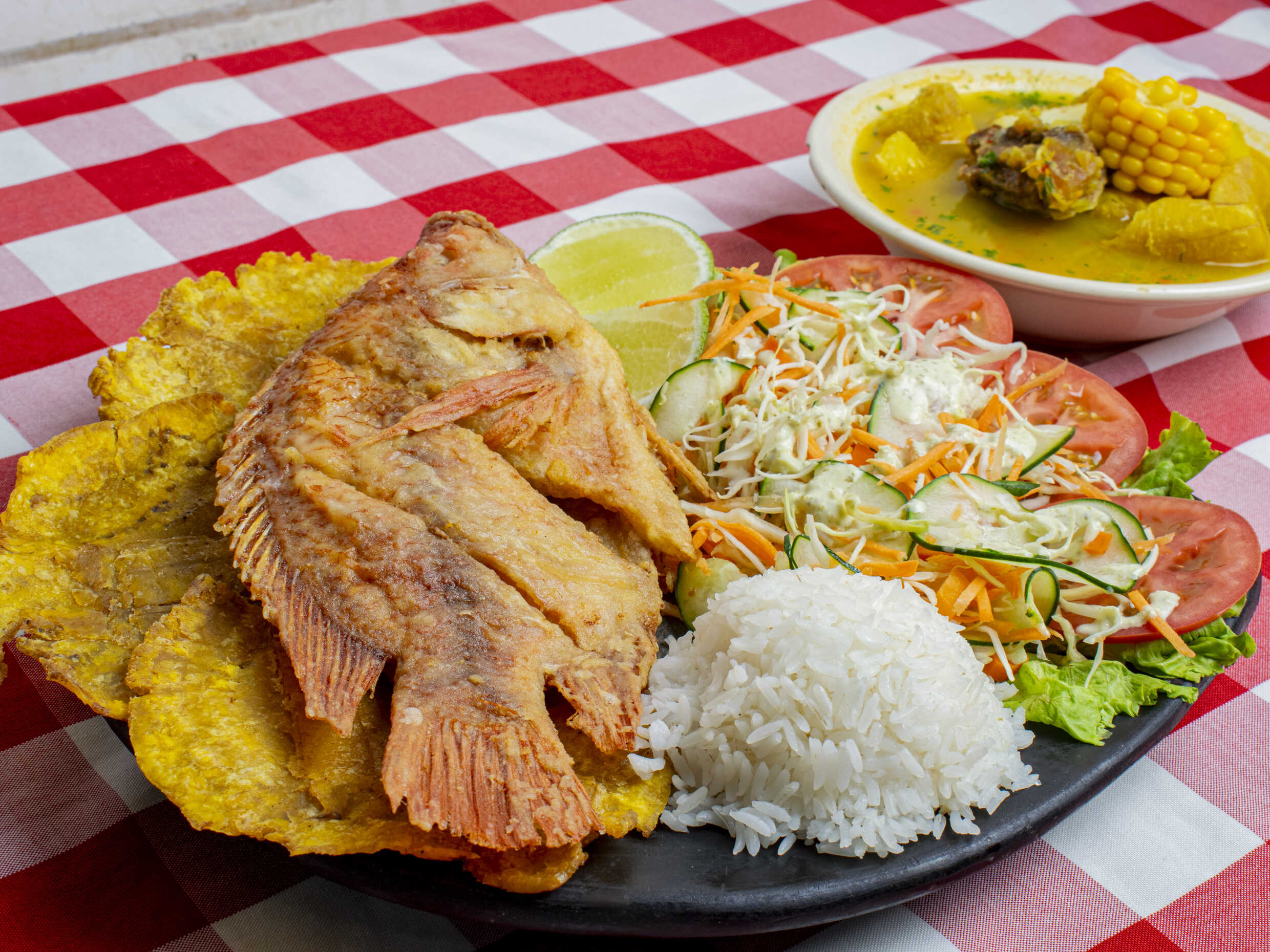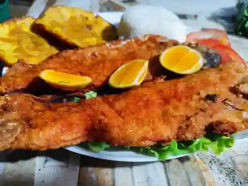 Trucha frita, acompañada de ensalada de batavía, zanahoria, pepino, cilantro, tostada de plátanos, limón y arroz.