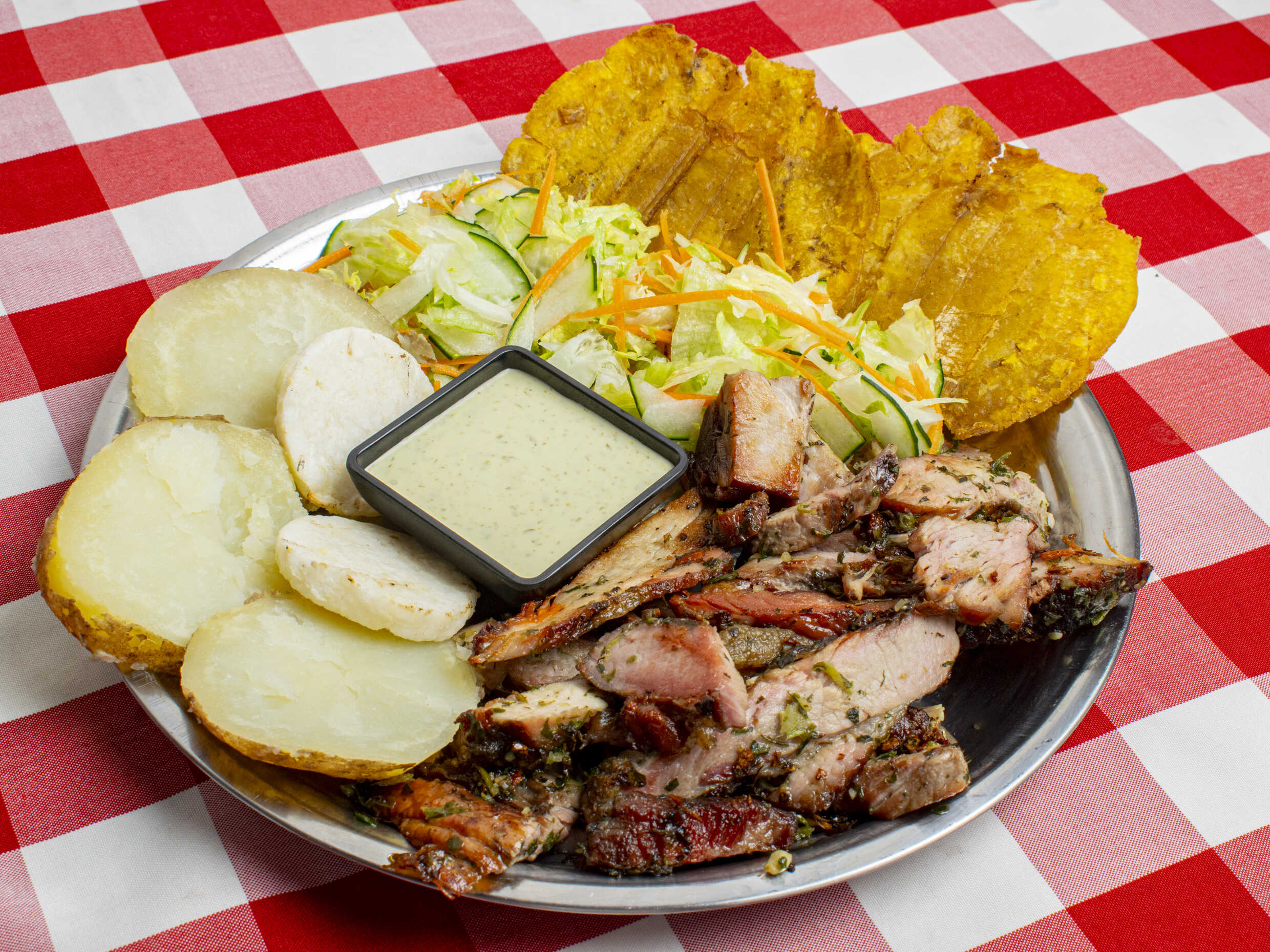 Chuleta, maicitos, jamón, chorizo, costilla ahumada, carne a la llanera con ensalada de batavía, zanahoria, pepino, cilantro, arroz, papas rústicas.