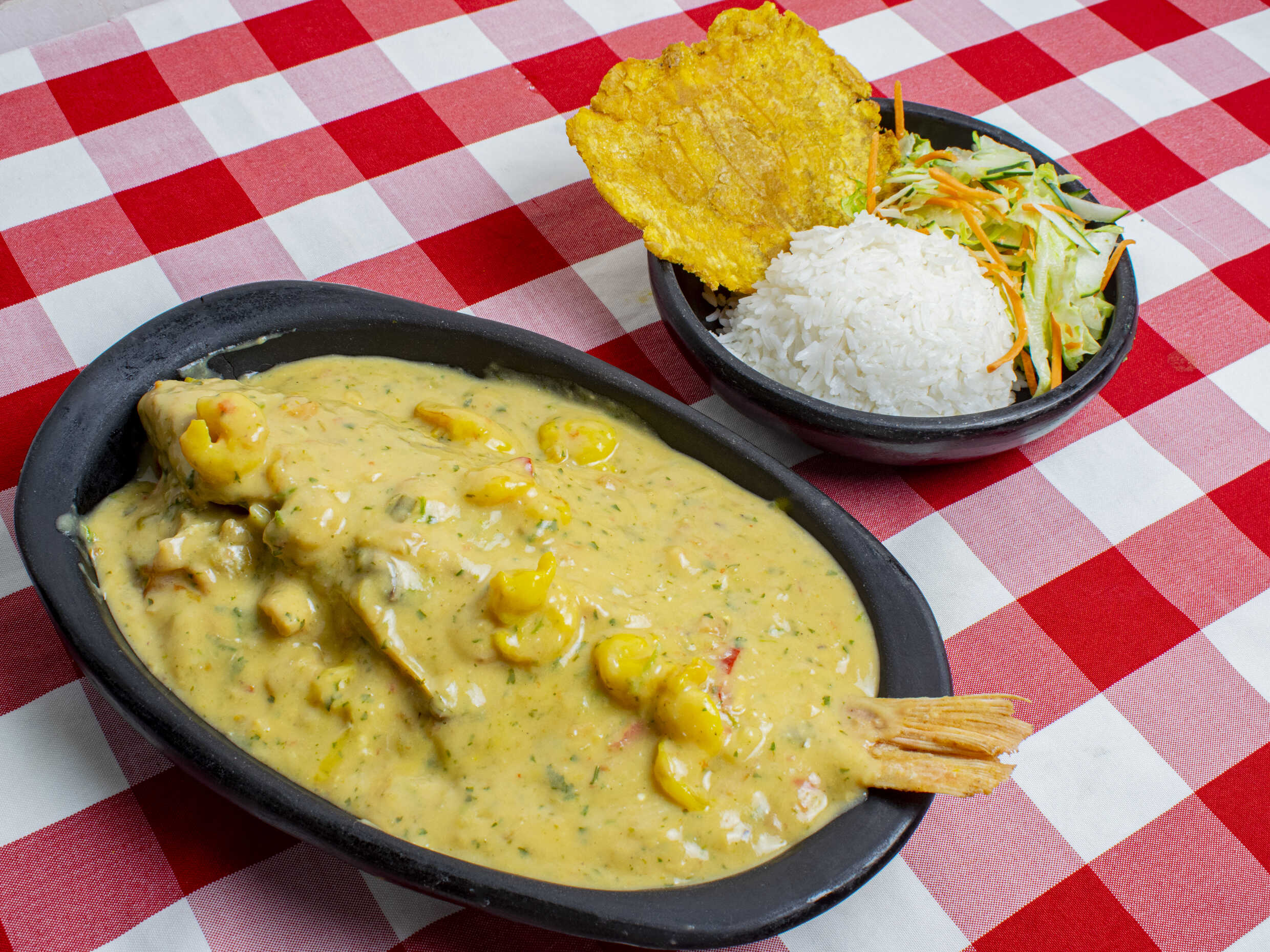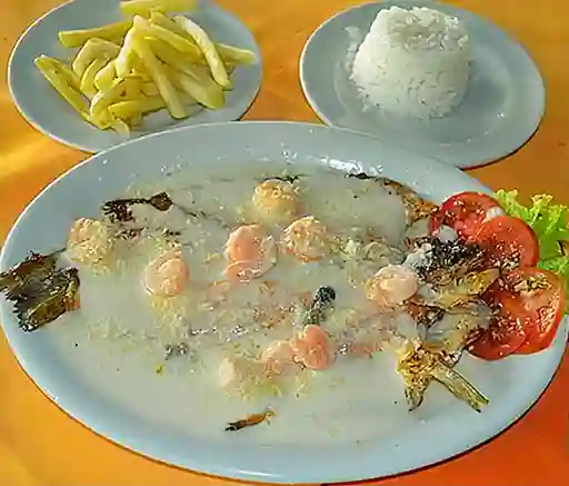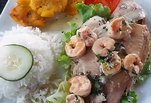 Tilapia bañada en salsa de camarón con camarones, acompañado de ensalada de batavía, zanahoria, pepino, cilantro, tostadas de plátanos y arroz.