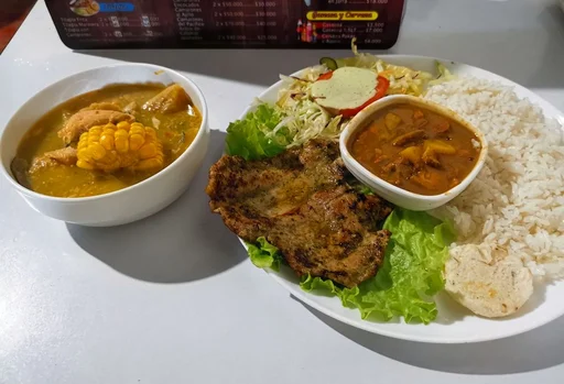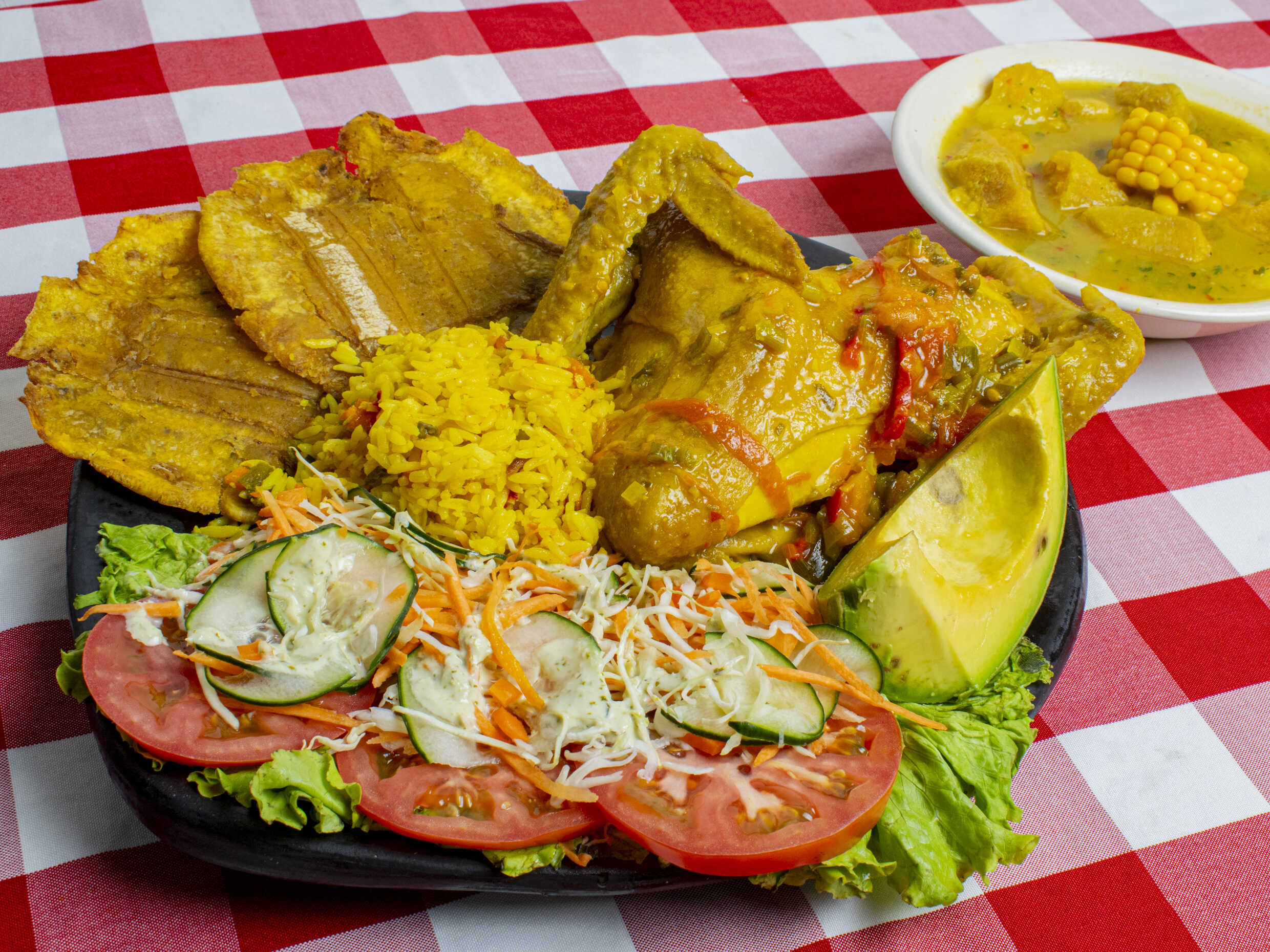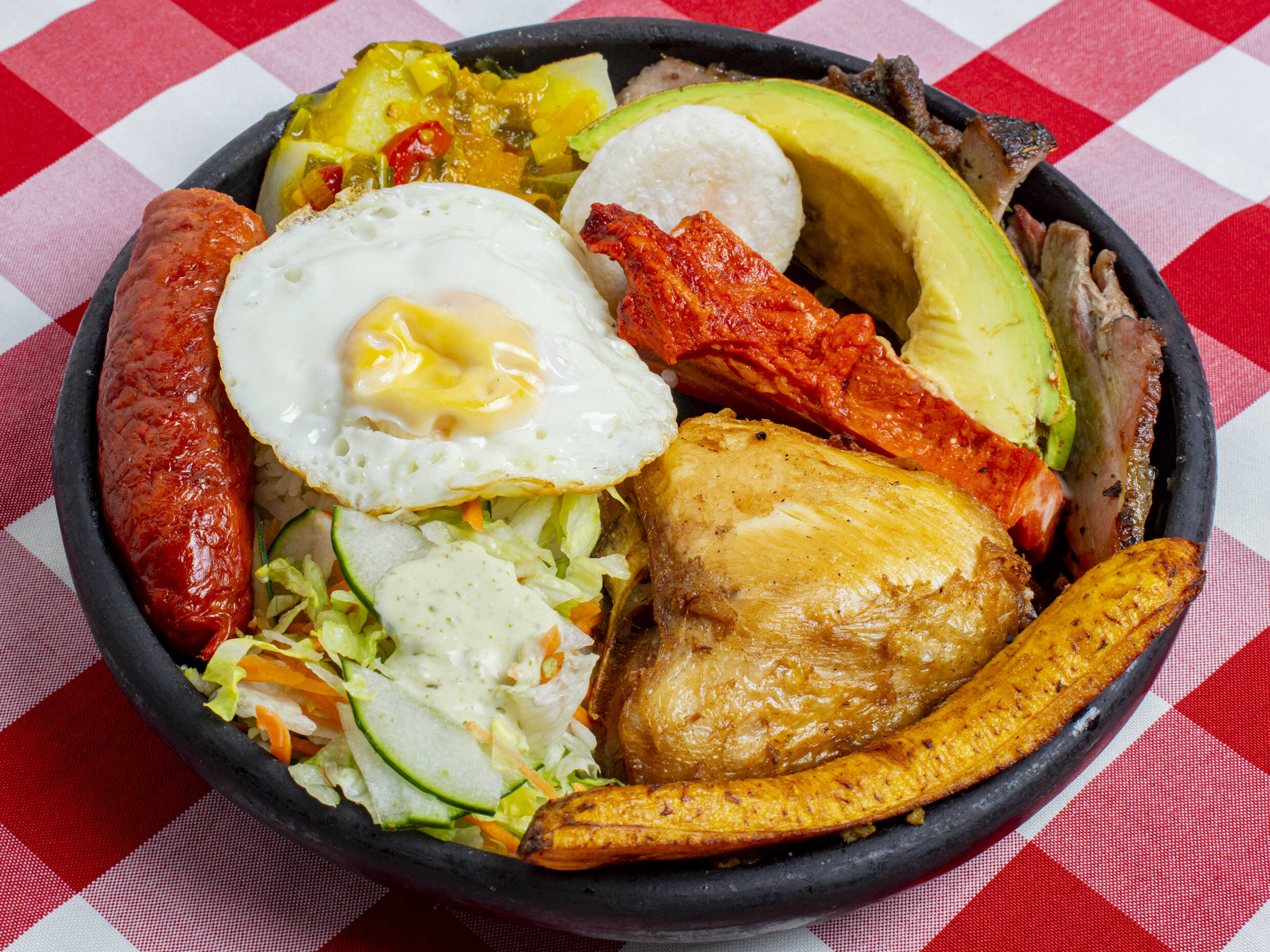 Pollo frito, chorizo, costilla, filete de pollo o cerdo, arepa, papa cocida, tajada, huevo y aguacate.