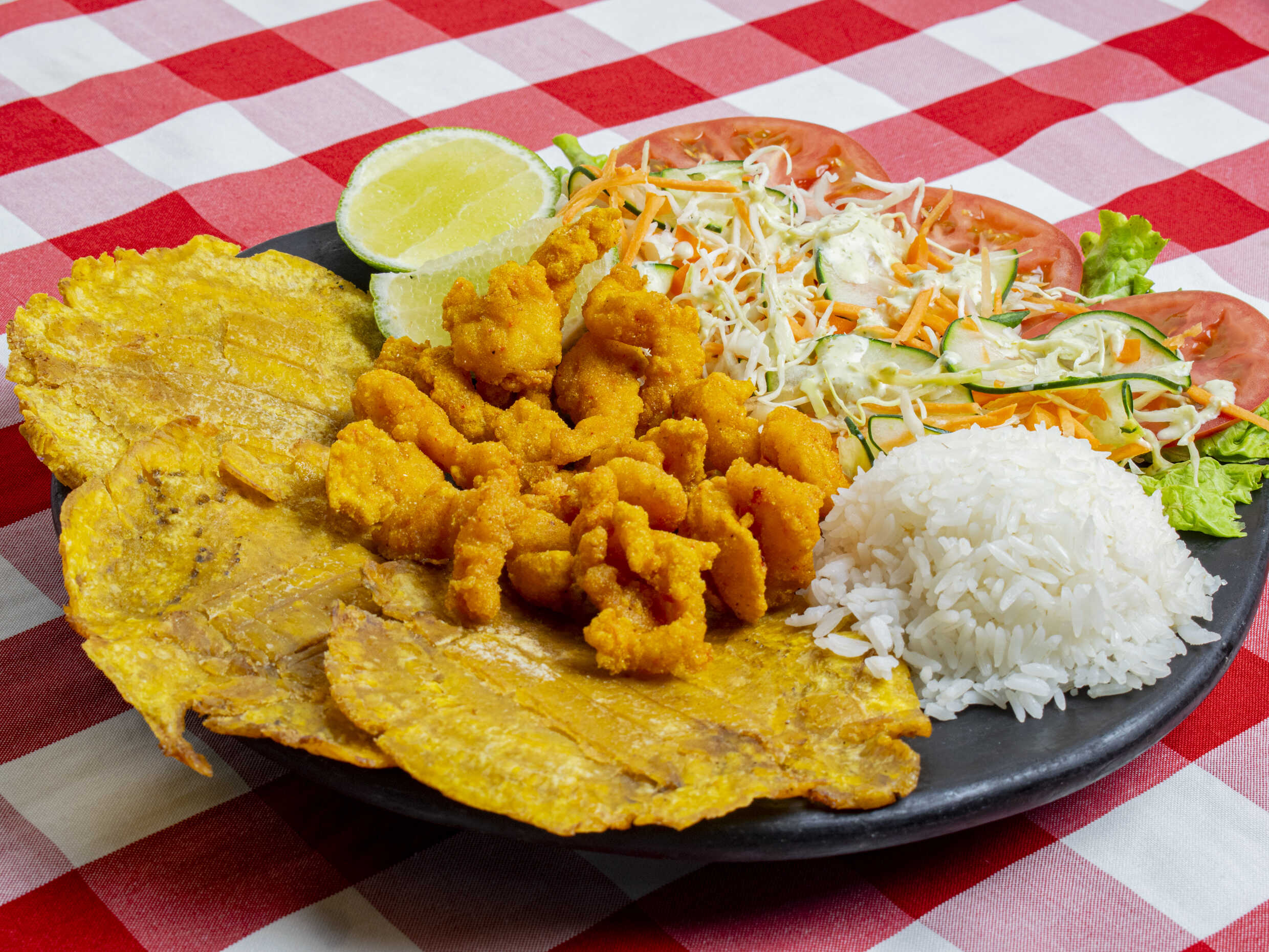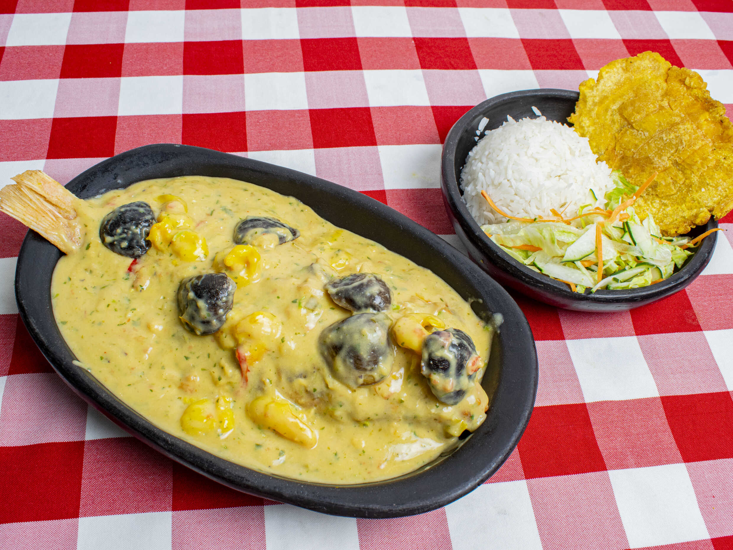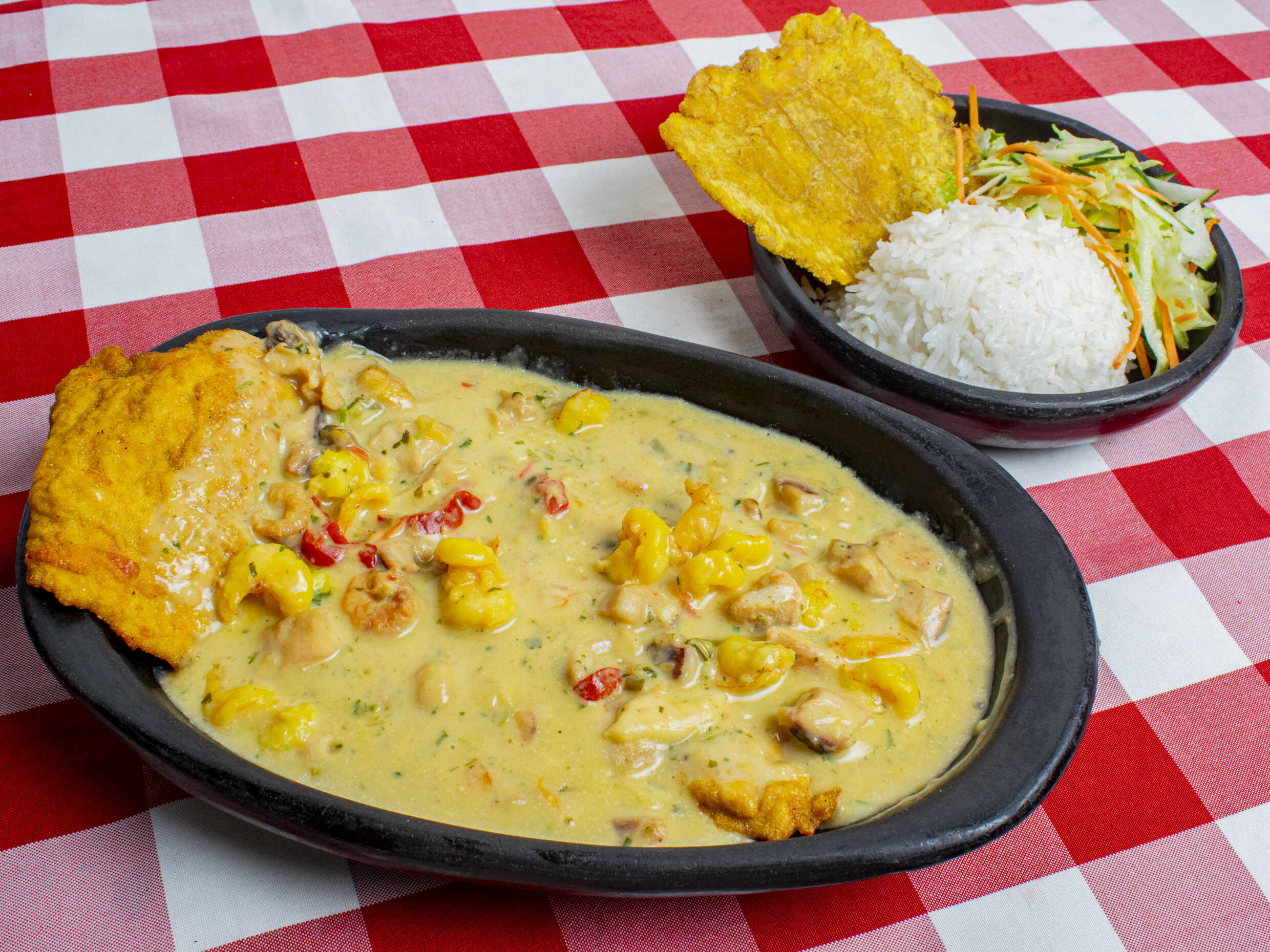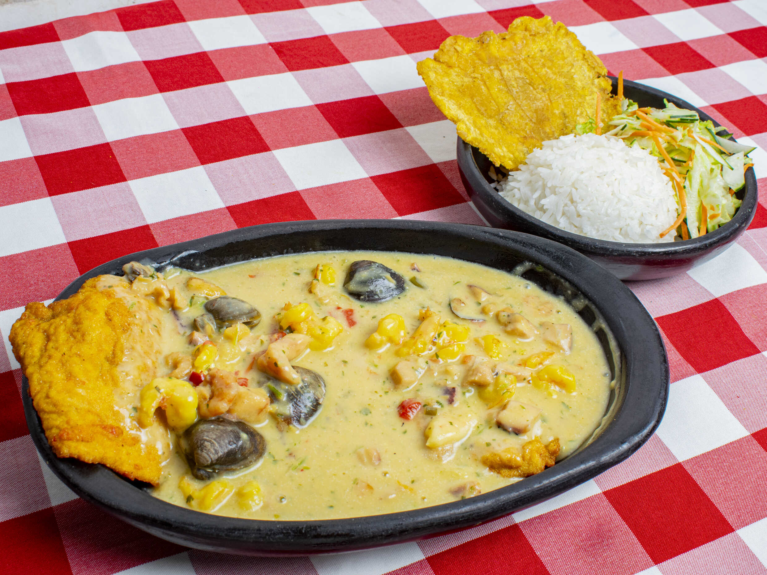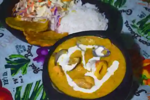Salsa marinera picante, pulpo, almeja, aros de pulpos, camarón, palmitos, calamar con ensalada de batavía, zanahoria, pepino, cilantro, tostada de plátano y arroz.