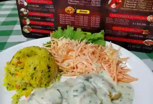 Chuleta en salsa marinera con camarones, acompañada de ensalada de batavía, zanahoria, pepino, cilantro, arroz, tostadas de plátanos, proteína (pollo, cerdo).
