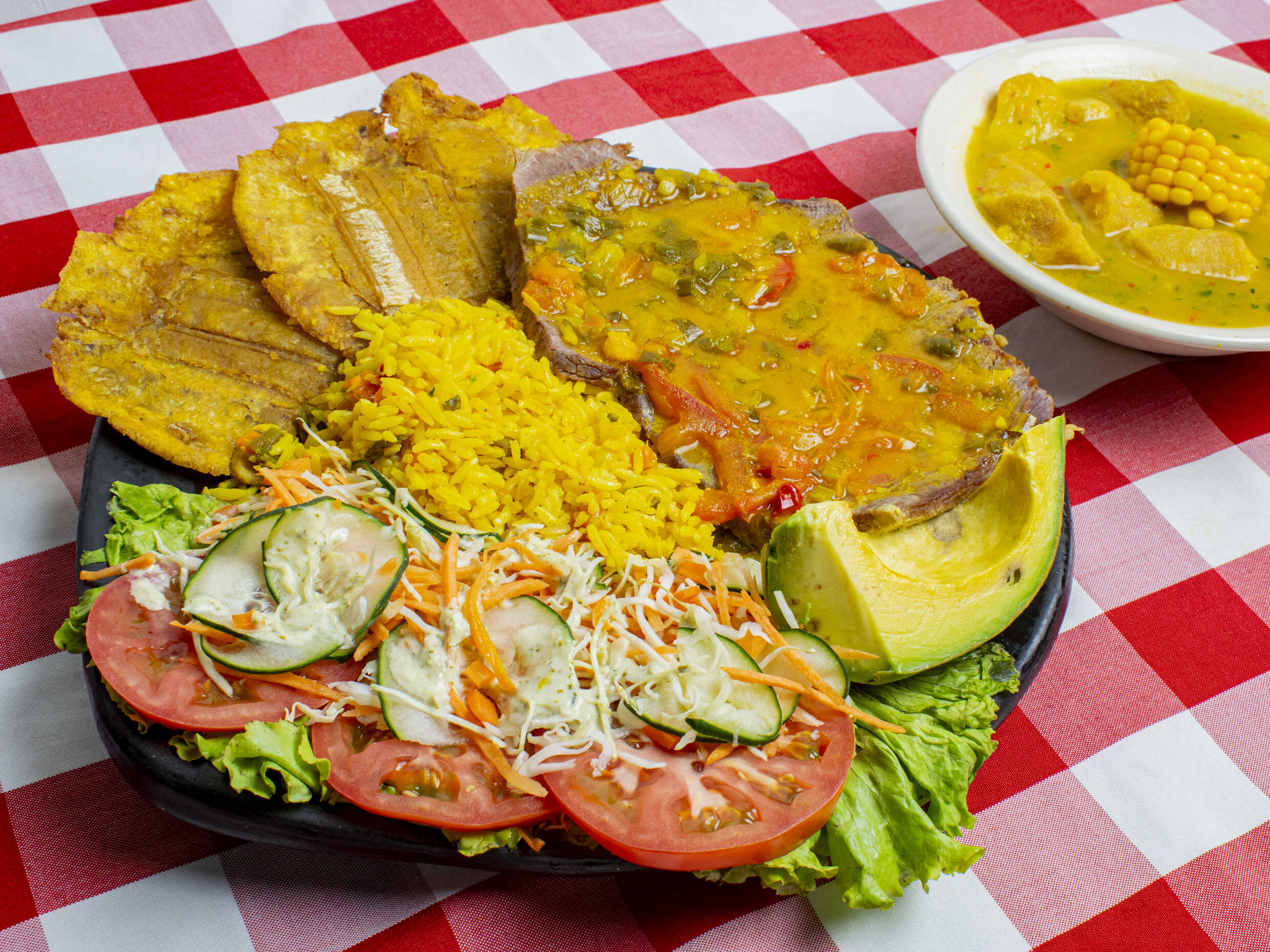 Sobrebarriga en Salsa Criolla, acompañada con sancocho del dia, arroz, tostada y ensalada de la casa.
