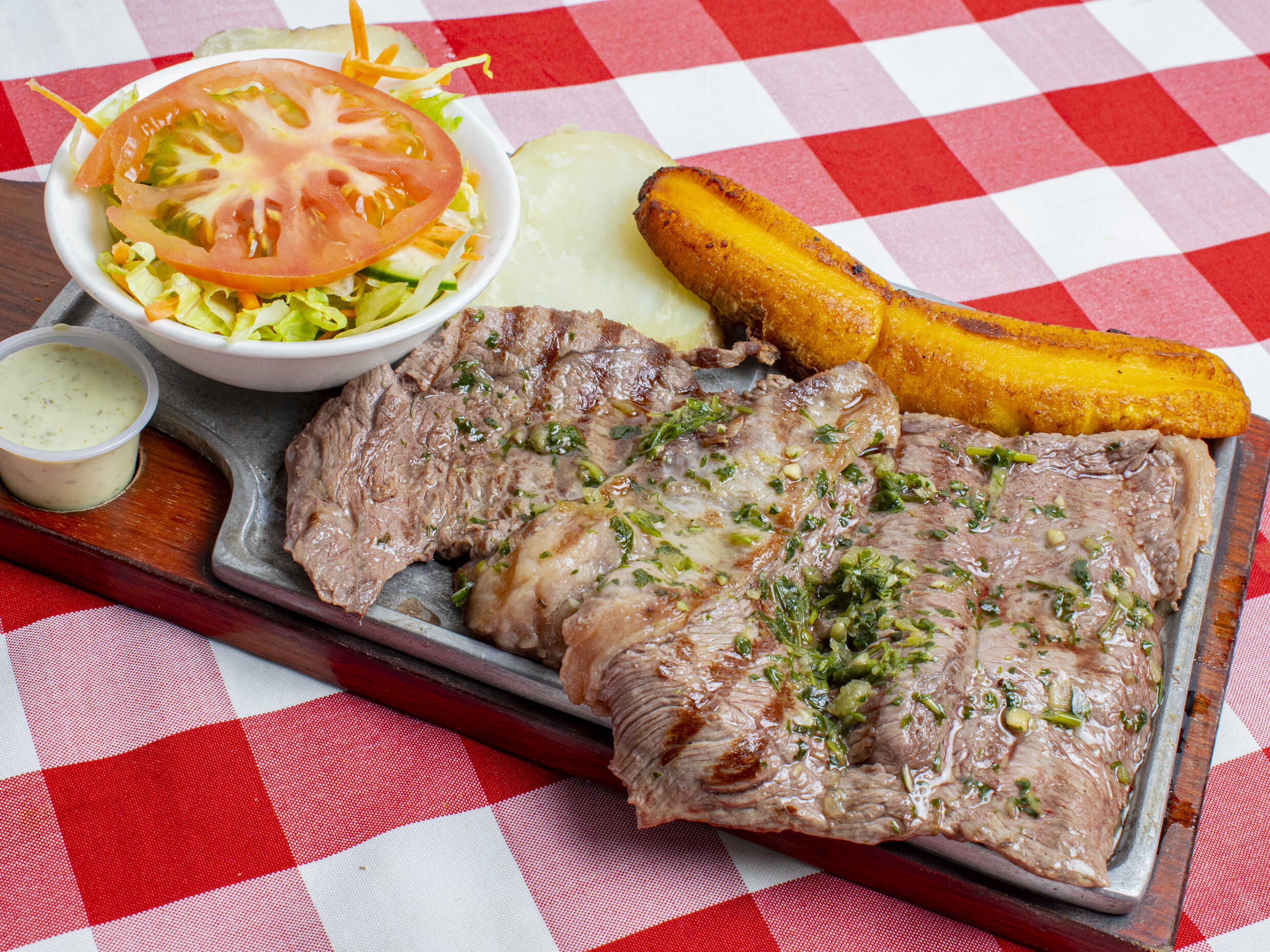 Carne de churrasco Dos churrascos, cada uno de 270 g, acompañado de papa rustica, ensalada y salsa de la casa..