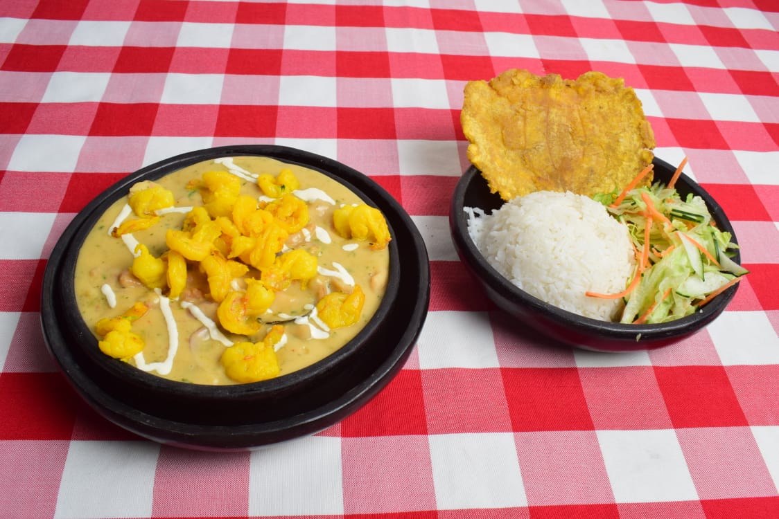 Cazuela bañada en salsa de mariscos, palmitos, almeja, pulpo, calamar y camarones. Acompañada de arroz, ensalada del día y tostadas.