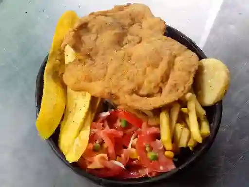 Acompañado de papa cocinada, arroz, carne a llanera, frijoles, ensalada.