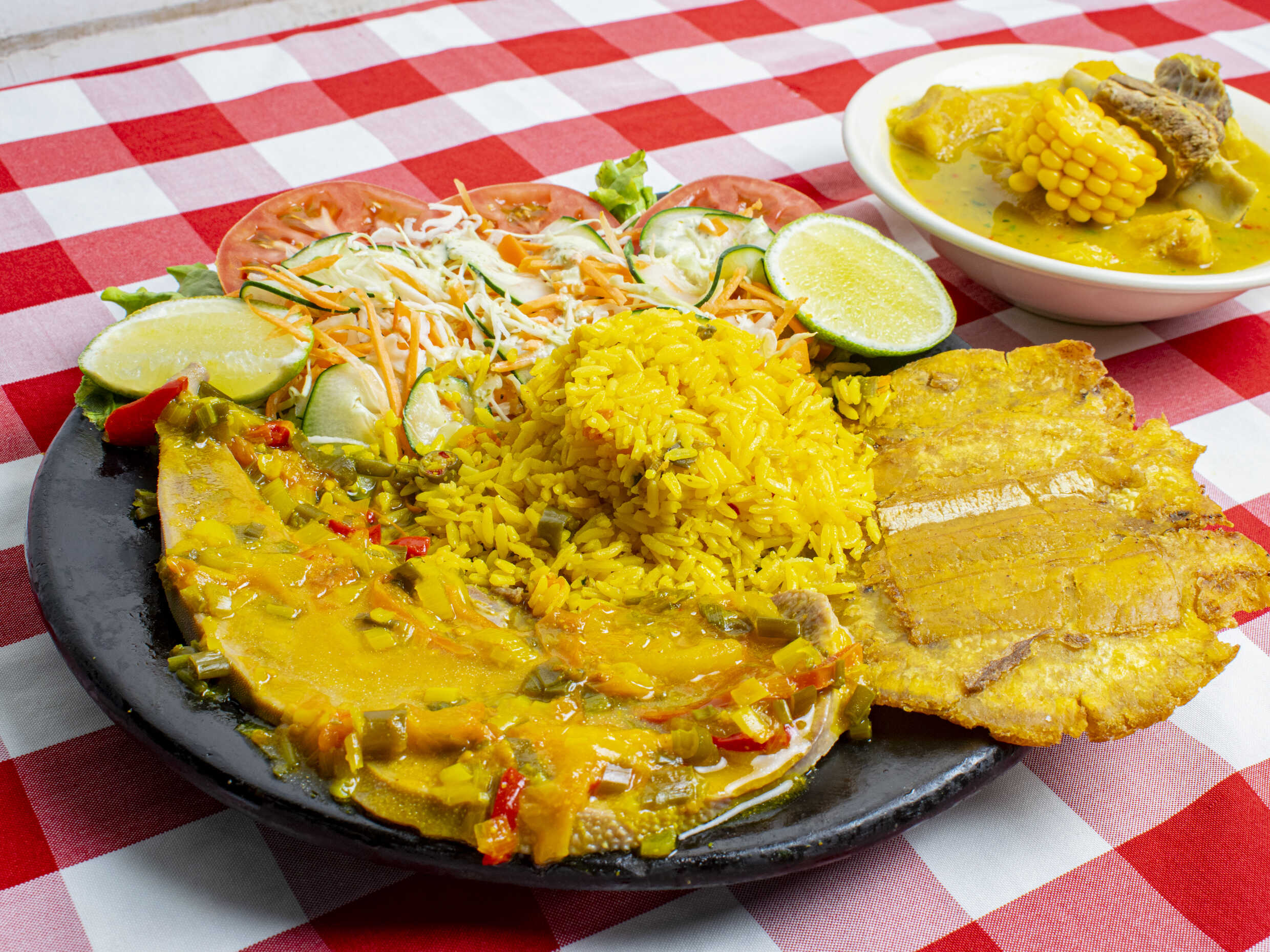 Lengua en Salsa Criolla acompañada con arroz, tostada, ensalada, sancocho del dia.