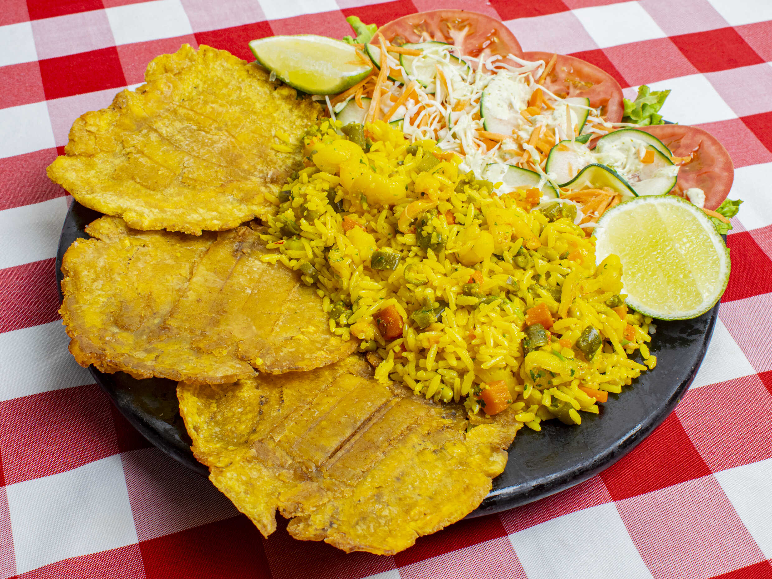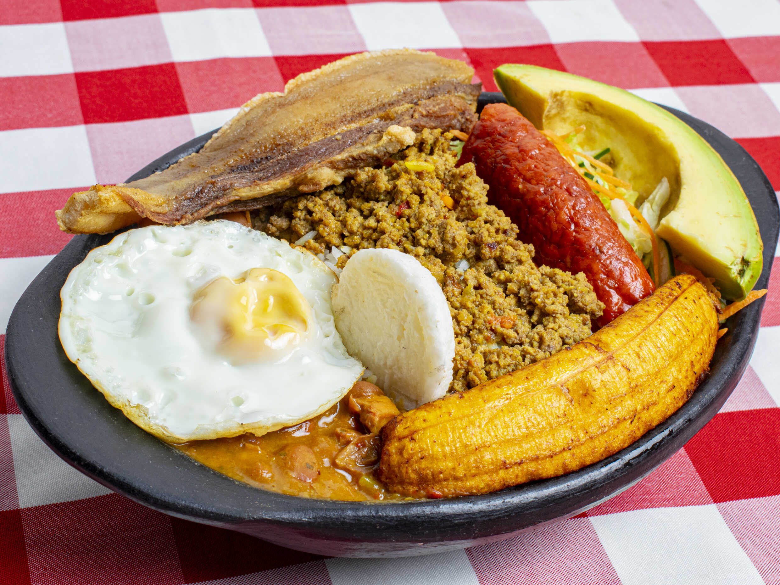 Arroz, Frijoles, chorizo, arepa, carne molida, chicharron, huevo frito, aguacate y tajada madura.