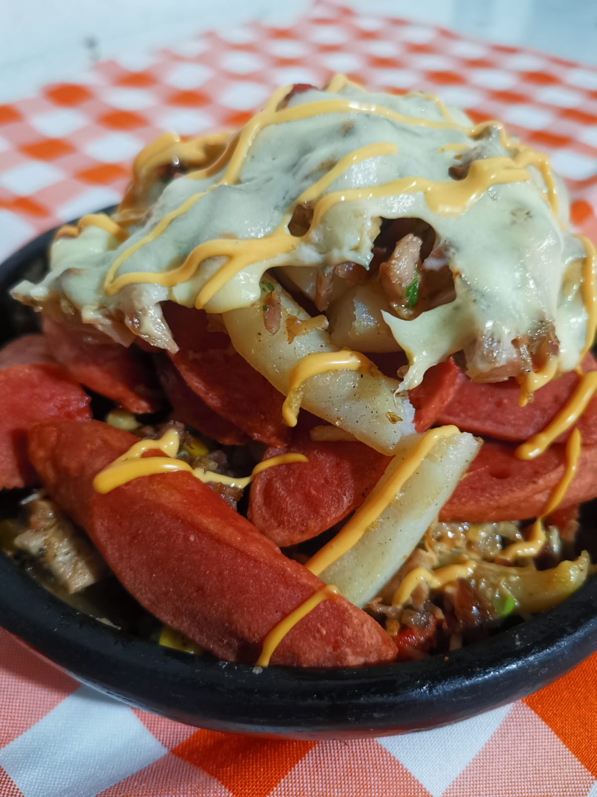 Deliciosa salchipapa Picadillo cerdo pollo jamón costilla queso salchichas con picadillo, cerdo, pollo, jamón, costilla, queso y salchichas.