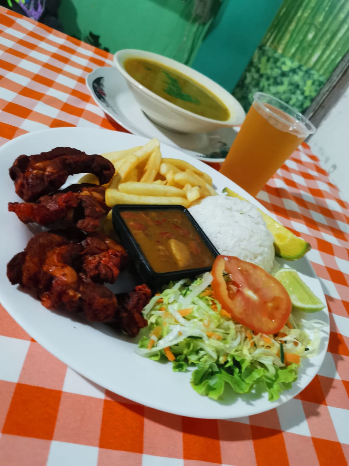Almuerzo ejecutivo con costilla ahumada, papas a la francesa, arroz, frijol, ensalada y sopa del día.
