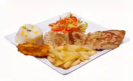 Chuleta acompañada con arroz, papa Rustica, salsa criolla, y ensalada.