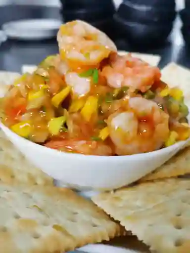 Ceviche con camarones, bañado en salsa de tomate, acompañamiento a elegir.