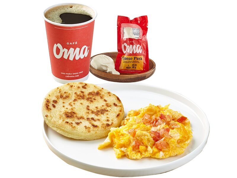 Huevos revueltos con arepa rellena de queso + americano o capuccino 300 ml