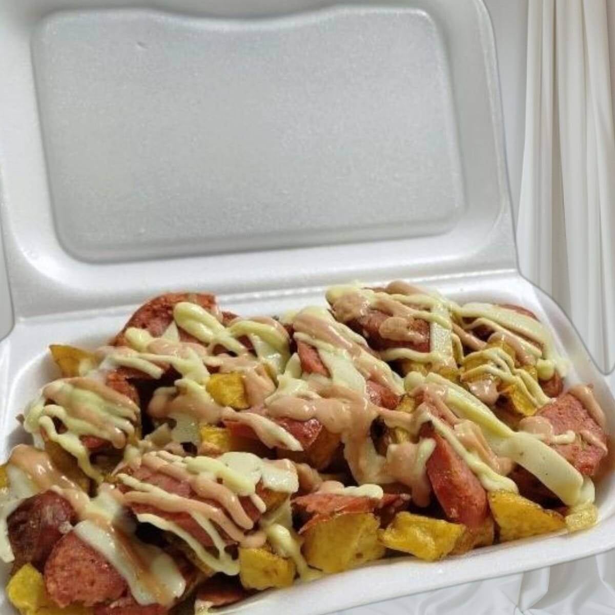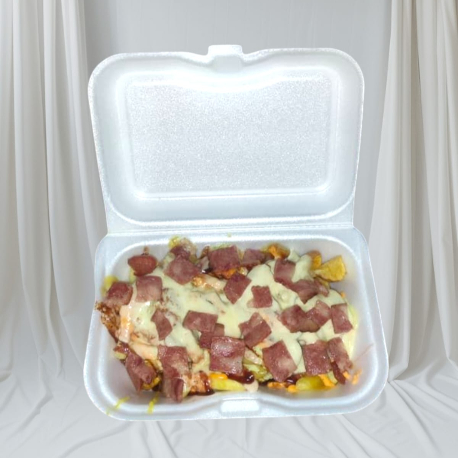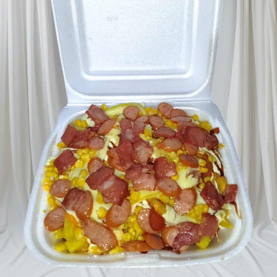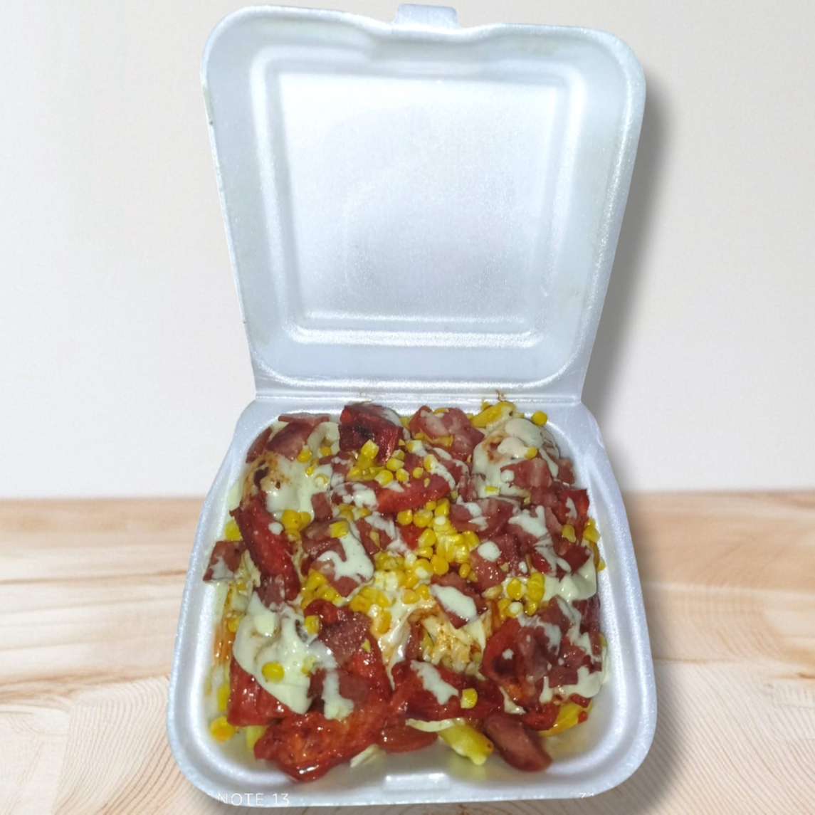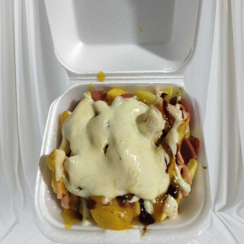 papas, salchicha, tocineta, maiz, salchicha ranchera, queso y salsas...para 2 o 3 pers