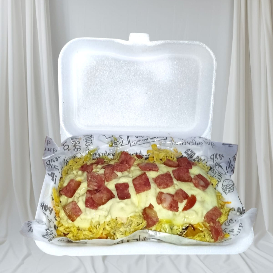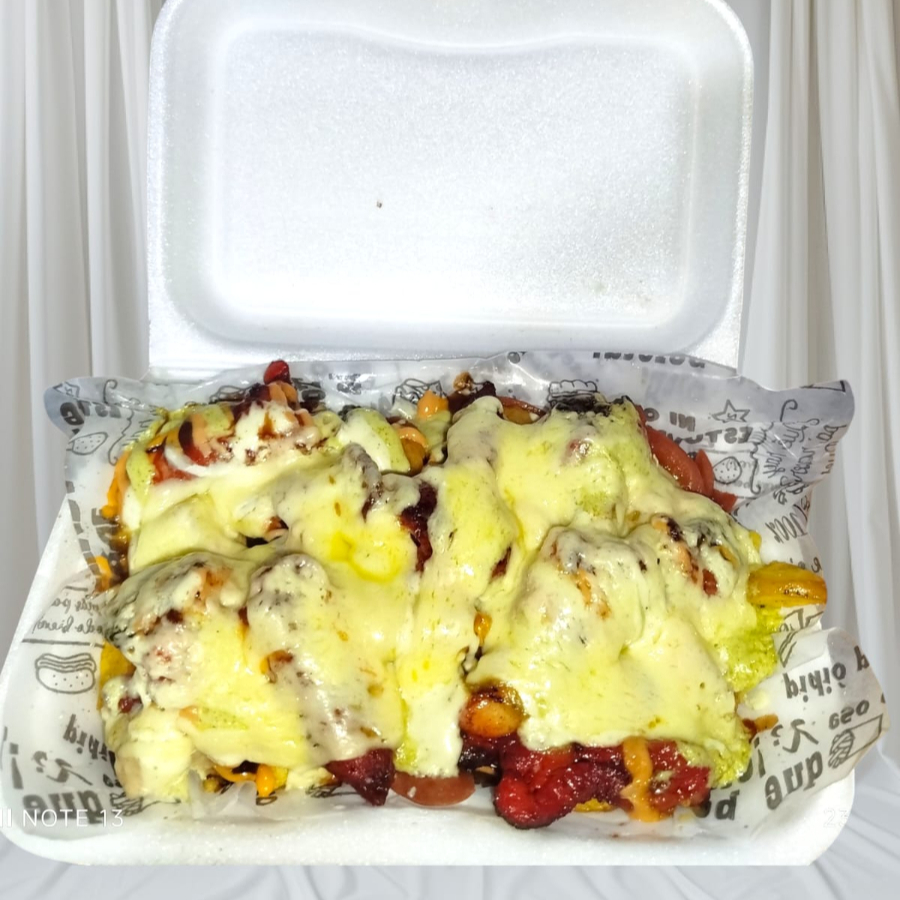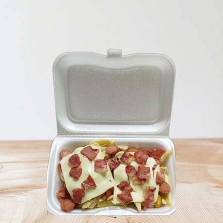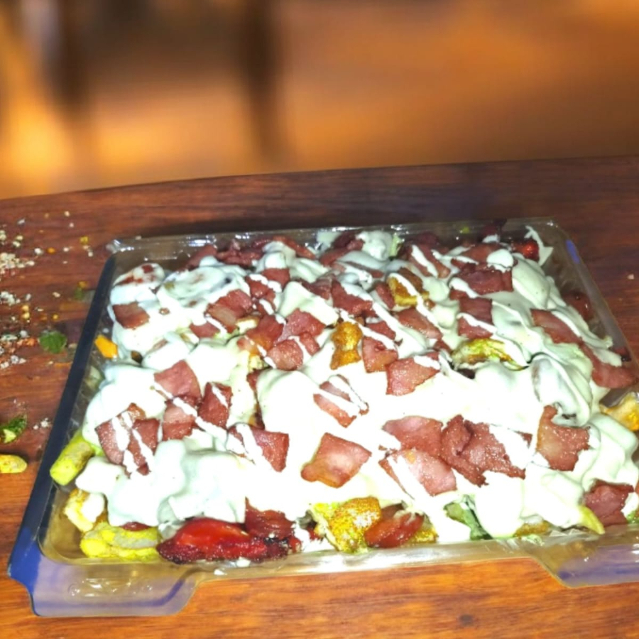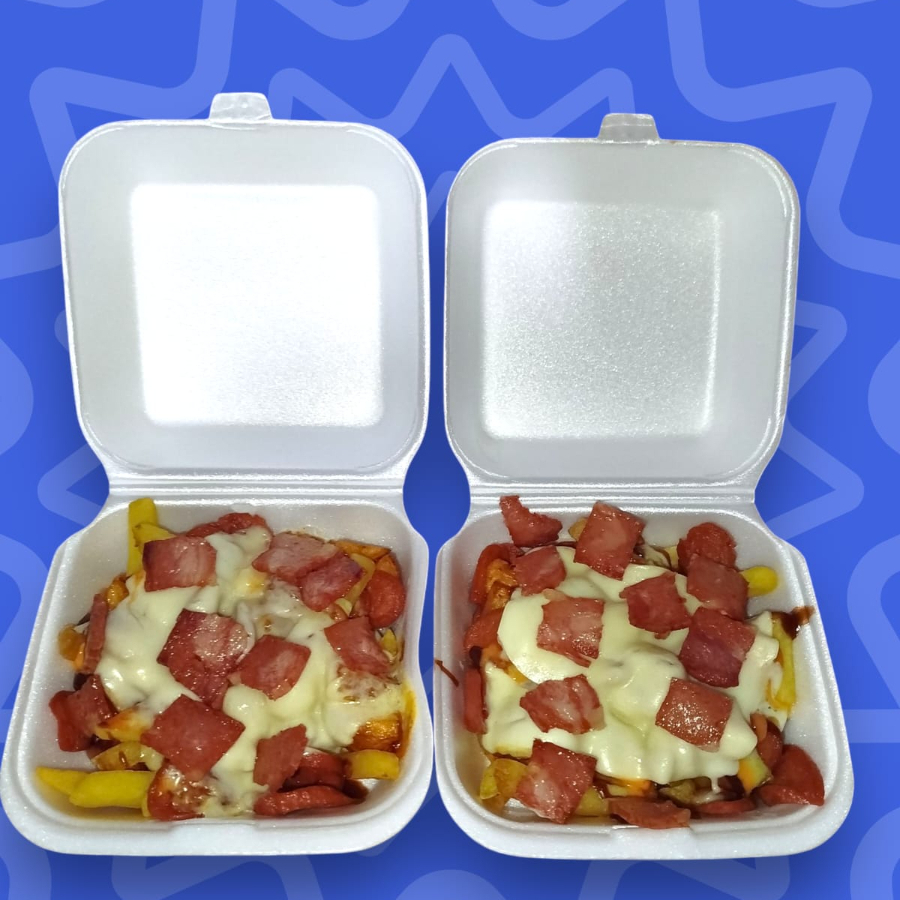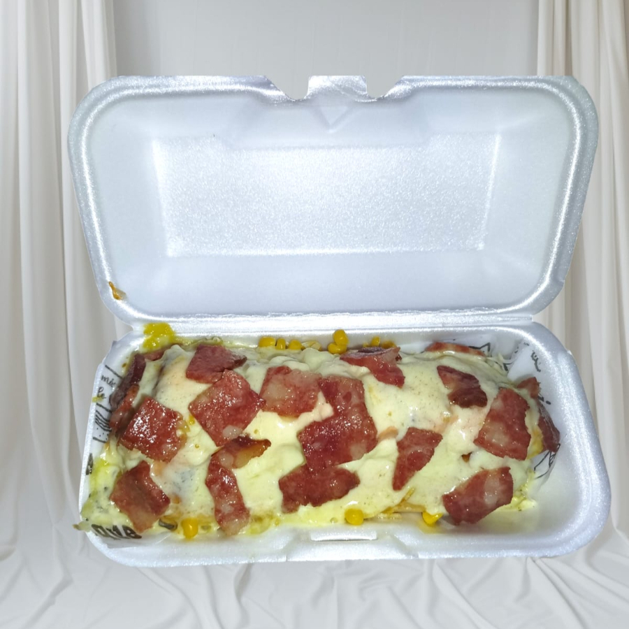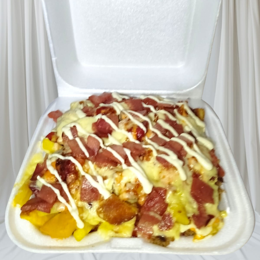 papas, salchicha, tocineta, maiz, salchicha ranchera, queso y salsas...para 2 o 3 pers