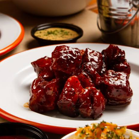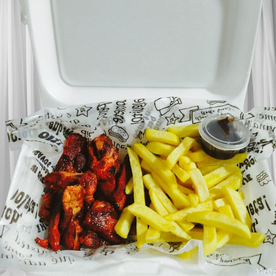 200 gr de costilla ahumada, 150 gr de papas a la francesa mas salsas