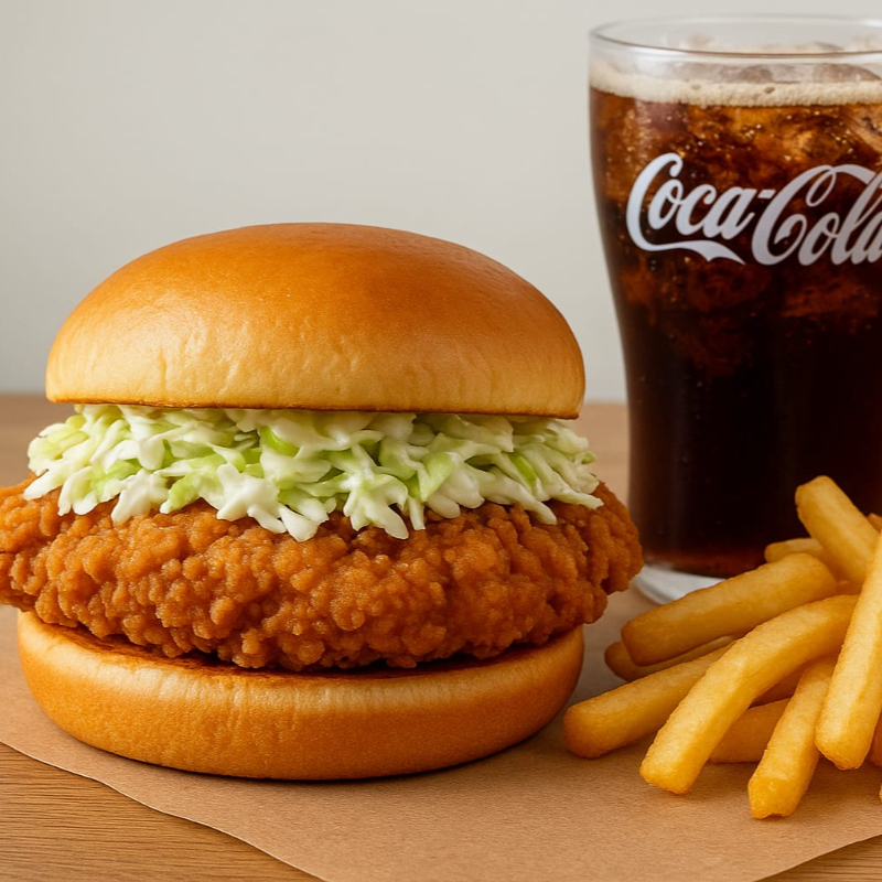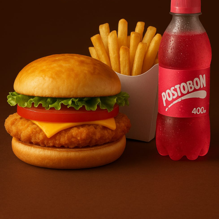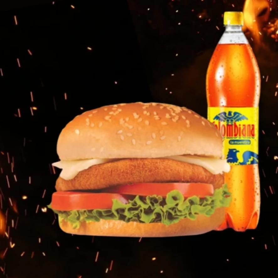 pan ANGUS (brioche), pollo apanado, queso cheddar, rodaja de tomate, lechuga y salsas, acompañado con 150 gr de papas a la francesa y una gaseosa postobon de 250 ml