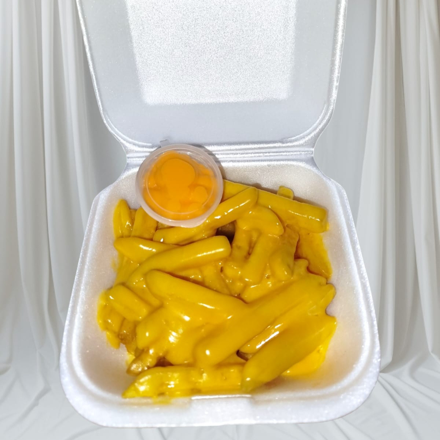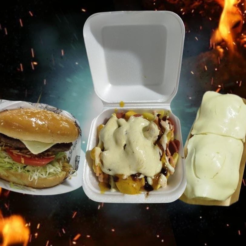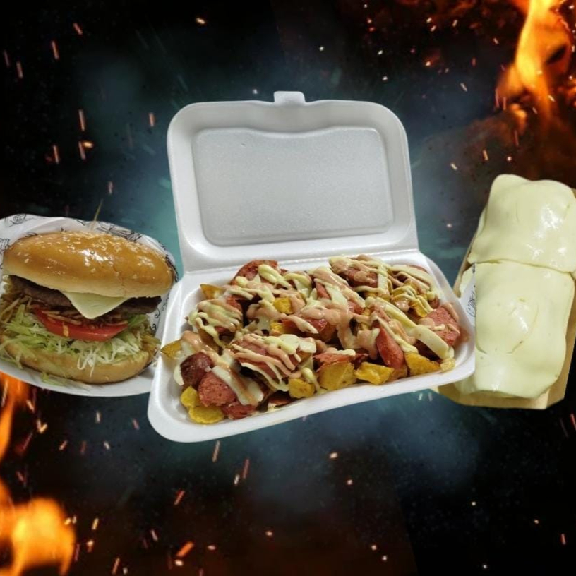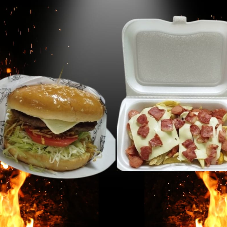 Choripapa sencilla( papa francesa, papa criolla, salchicha, chorizo , queso y salsas) + hamburguesa sencilla