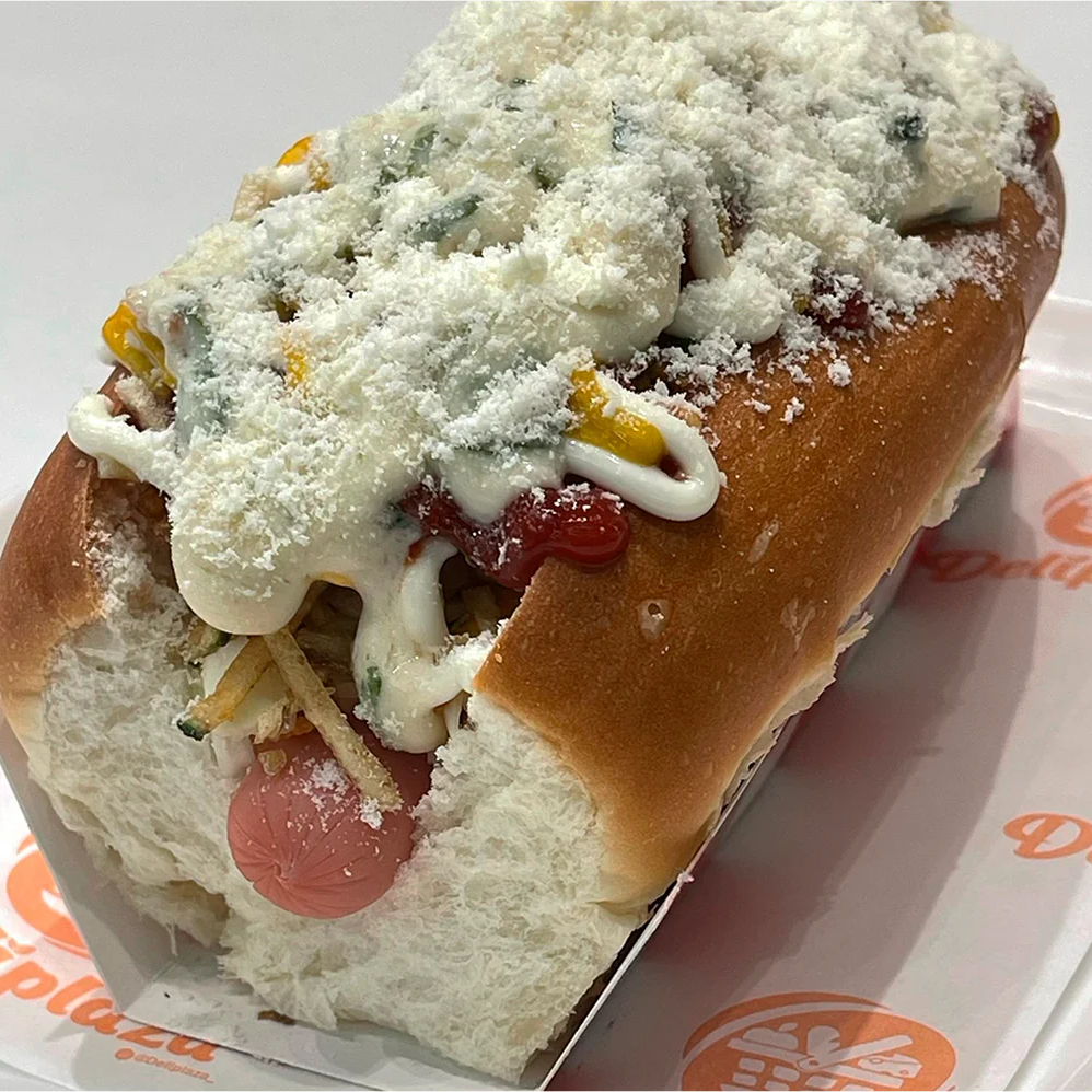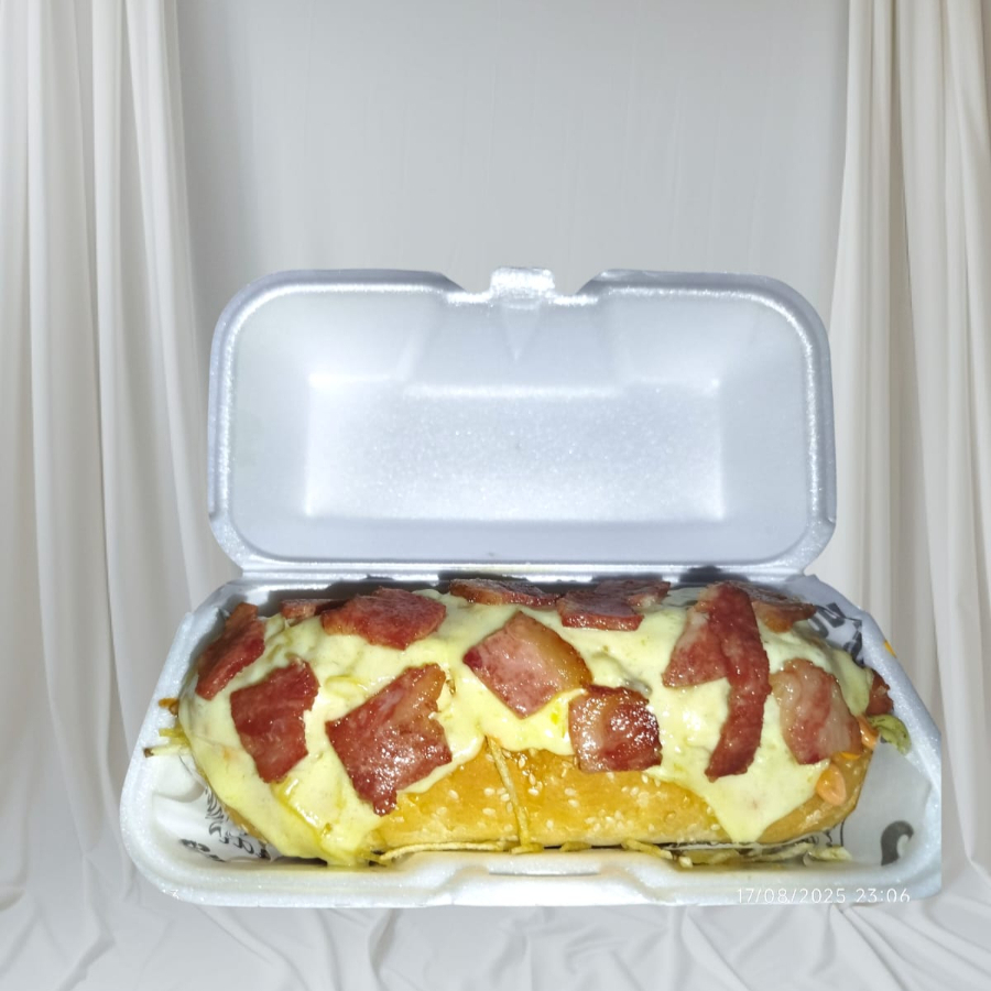 pan bimbo, salchicha, ripio, salsas, tocineta y queso