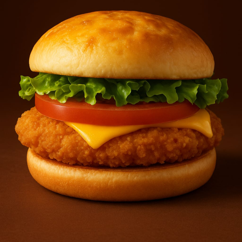 pan ANGUS ( brioche), pollo apanado, queso cheddar, rodaja de tomate, lechuga y salsas