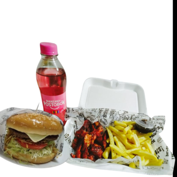 hamburguesa sencilla, gaseosas econolitro postobon, 200gr de costilla ahumada en salsa bbq y 150 gr de papas a la francesa.