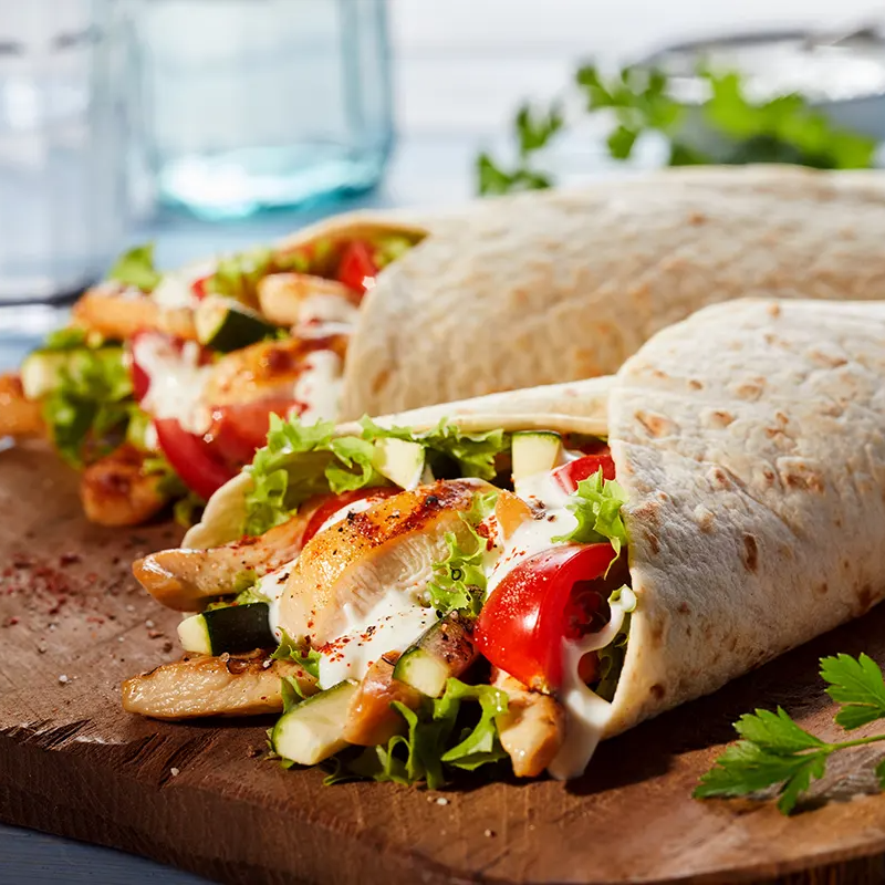 tortilla, batavia, suero, salsa de la casa, tomate, cuadritos de pollo asado a la planchas