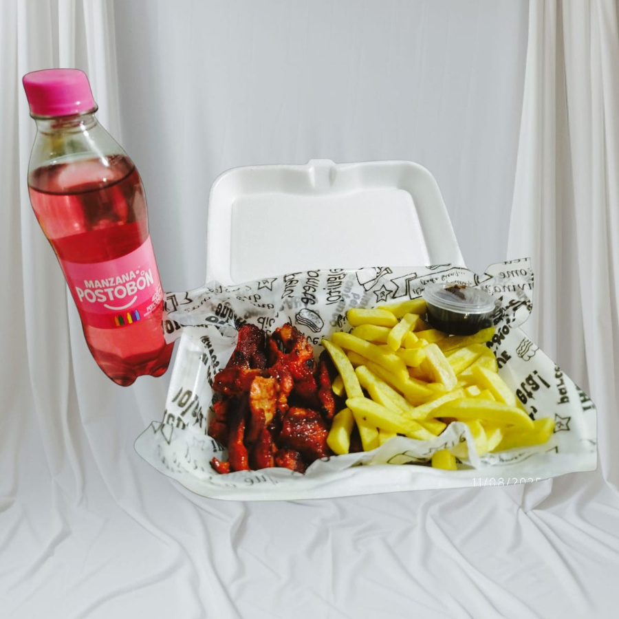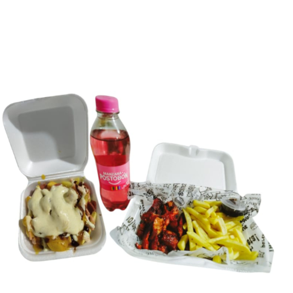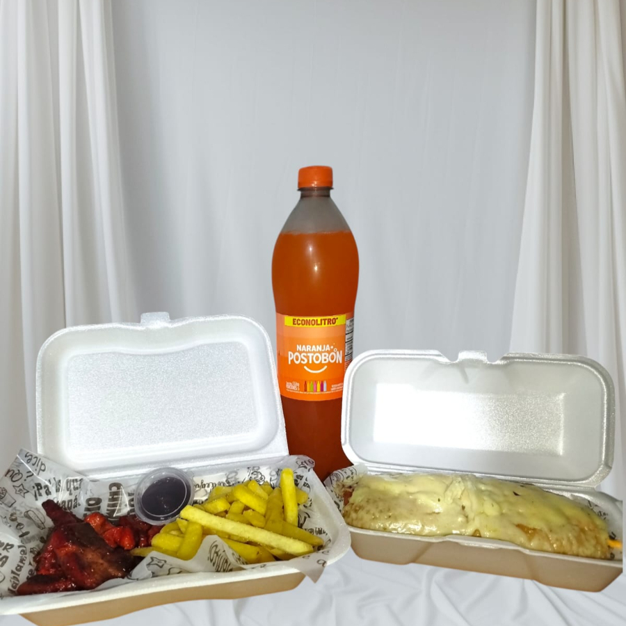 1 salchipapa sencilla personas, 200 gr de costilla ahumada con salsa bbq, 150 gr de papa a la francesas + econolitro Postobón