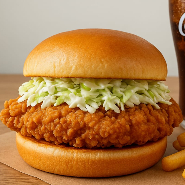 pan ANGUS (brioche), pollo apanado, ensalada tipo coleslaw y salsas
