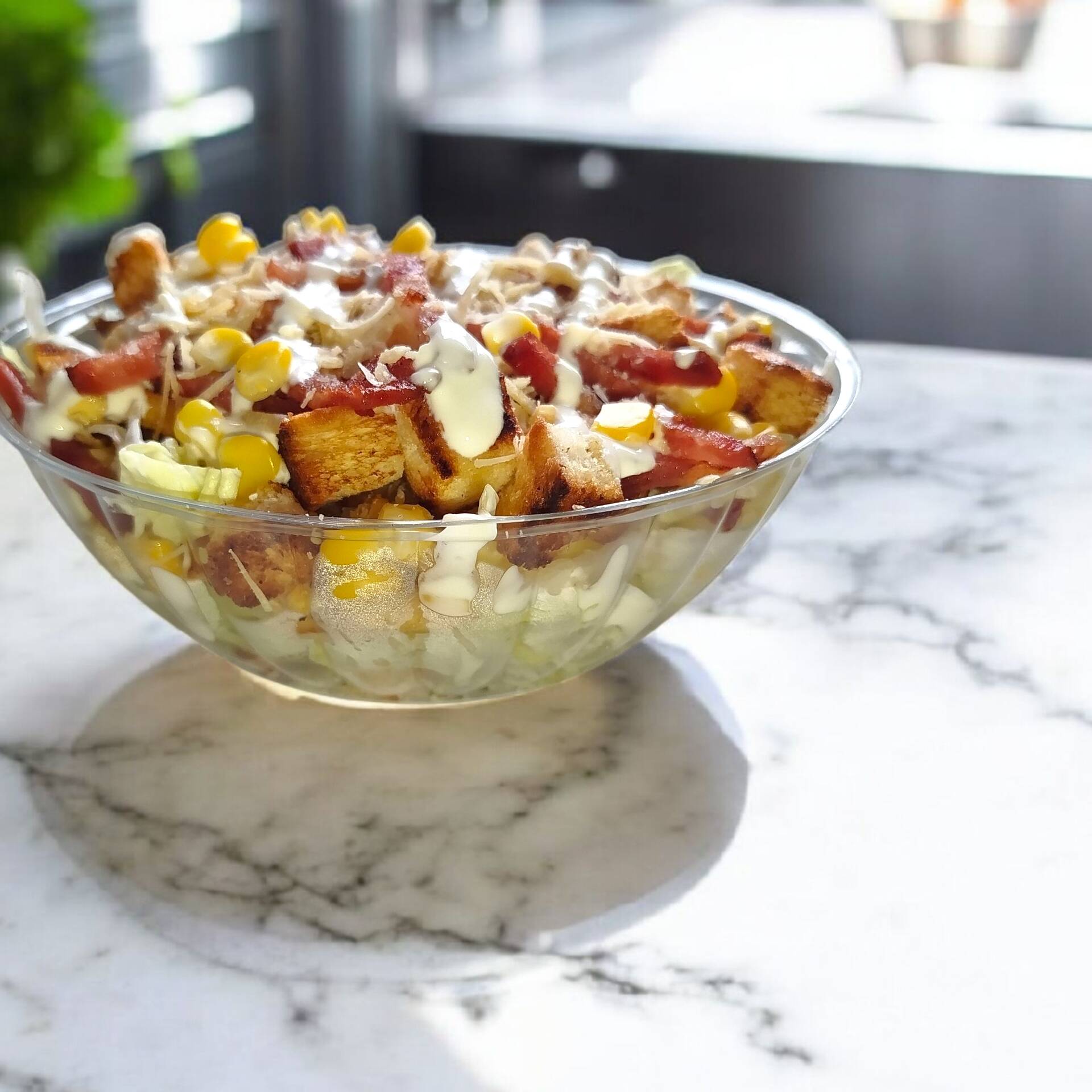 Batavia, maicitos, 200 gr de pollo a la plancha, tocineta, crotones, queso parmesano, crema de leche, aderezo de queso