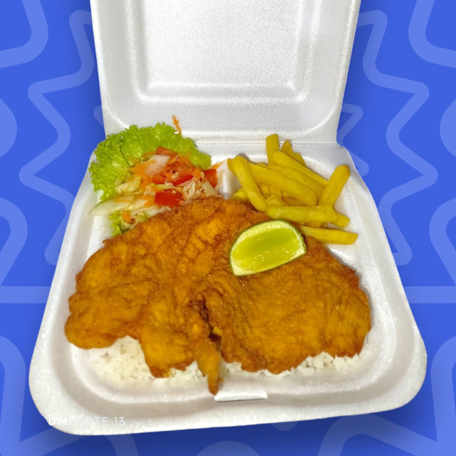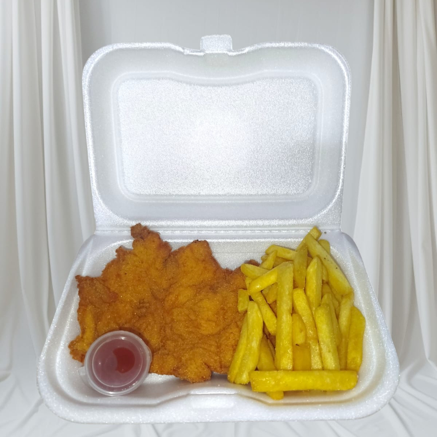 aproximadamente 110 gr de filete de pollo apanado acompañada con 150 gr de papa a la Francesa limón y salsa roja.
