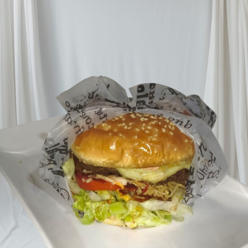pan bimbo, cebolla caramelizada, lechuga, tomate, filete de pollo apanado, ripio, queso, salsas y tocineta