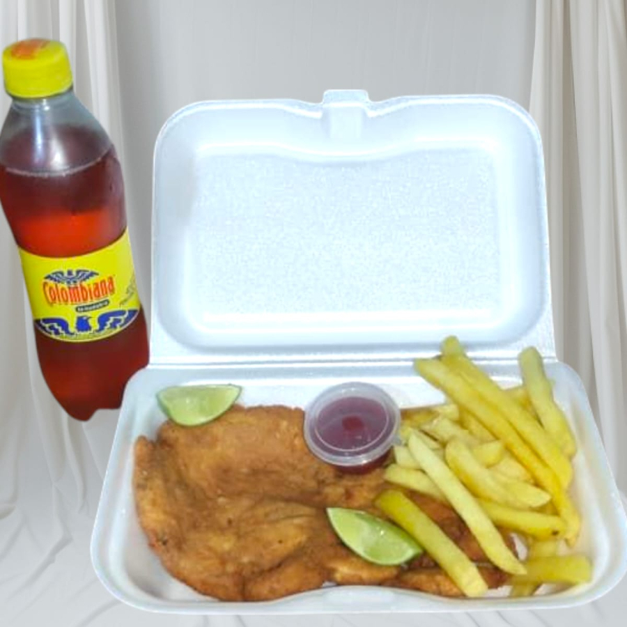 110 gr aproximadamente de filete de pollo apanado acompañada con 150 gr de papa a la francesa, limón, salsa roja y gaseosa Postobón 250 m.l