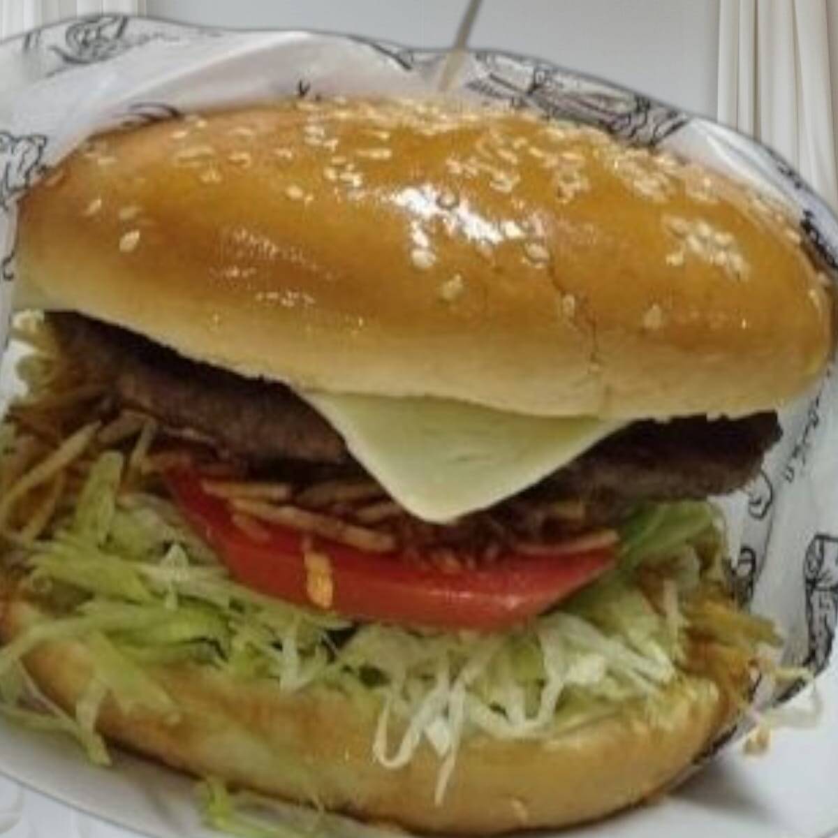 pan bimbo, cebolla caramelizada, lechuga, tomate, ripio, doble carne de hamburguesa, tocineta, queso y salsas