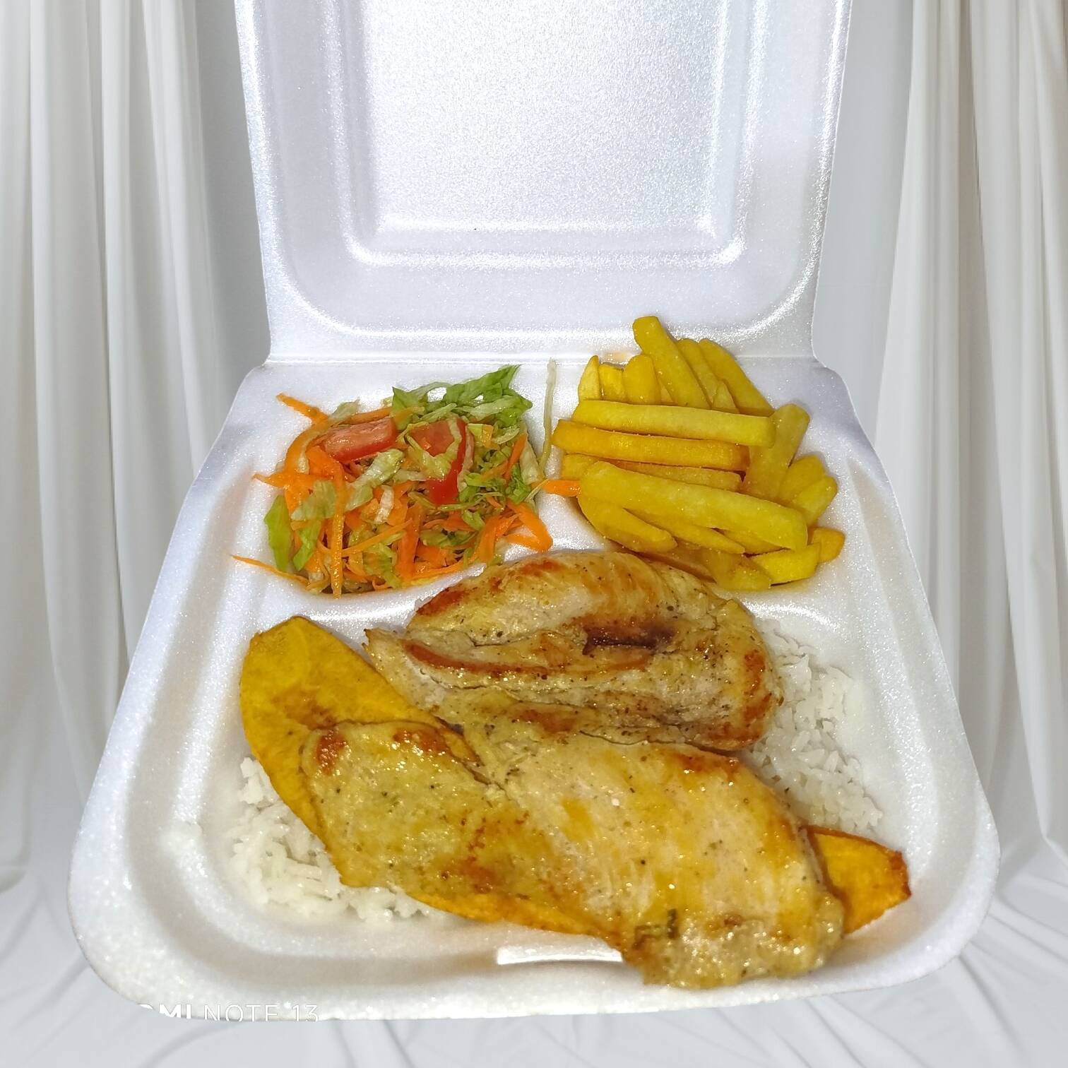 arroz, papa a la fancesa, tajada, ensalada de la casa, filete de pollo asado a la plancha, acompañado con una gaseosa de 250 ml