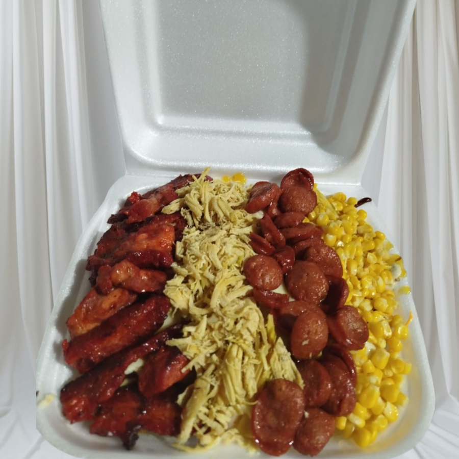 papas, salchicha, queso,costilla, maiz, pollo desmechado, chorizo y salsas.