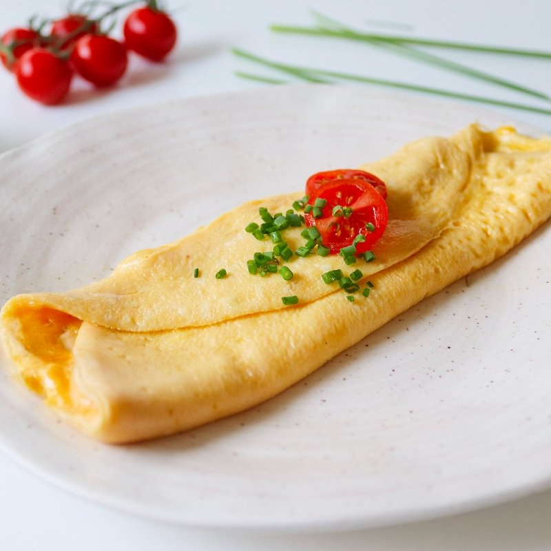 Huevos omelette acompañado con pan francés, tomate, tajada + bebida de tu elección
