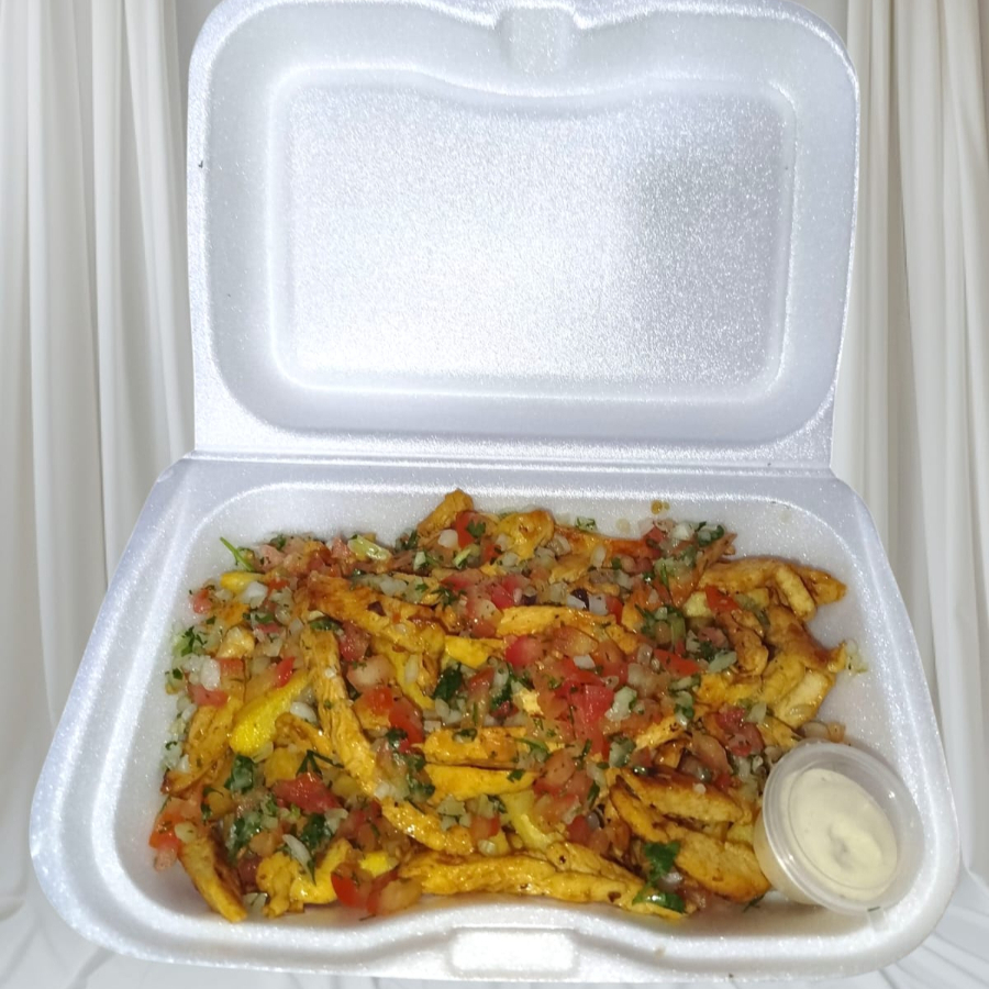 papas a la francesa, trozos de pollo asado a la plancha con pico de gallo y salsa de la casa