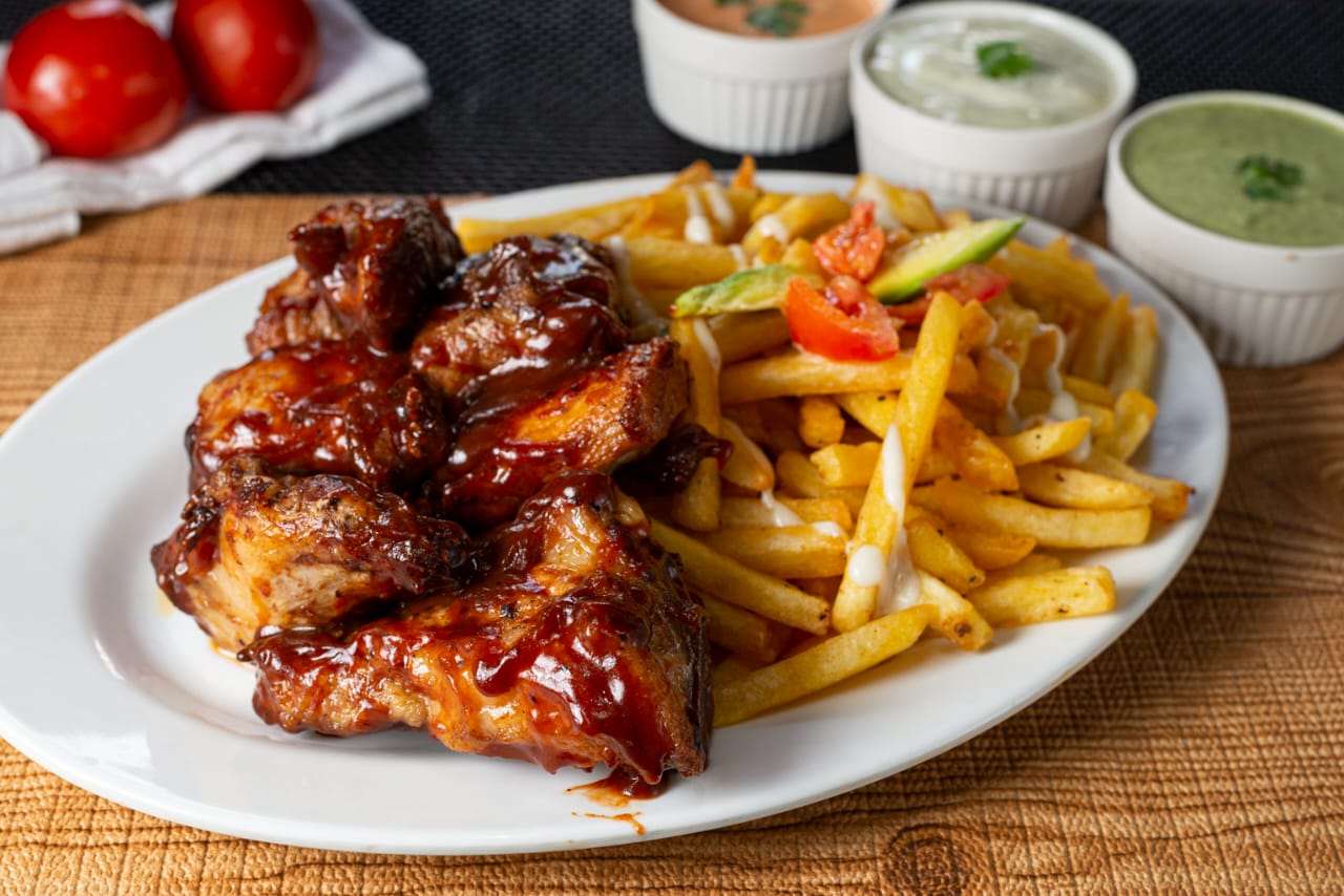 250 gr de costillas de cerdo BBQ con porcion de papas a la francesa y ensalada