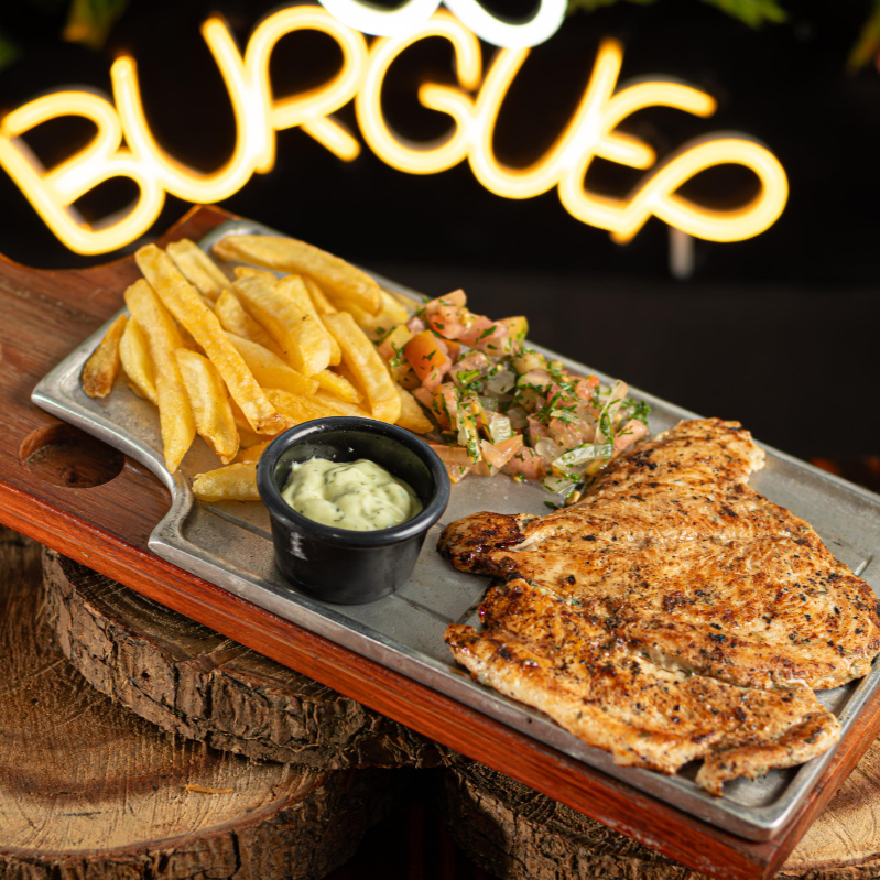 Filete de pollo 200 gramos, papa a la francesa, ensalada y salsa de la casa