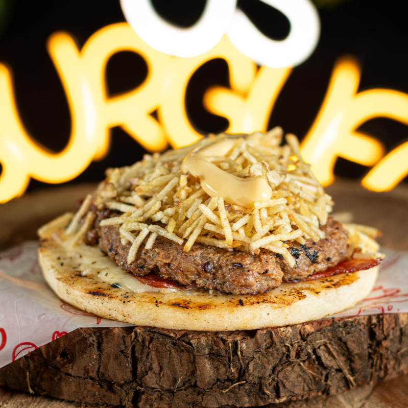 Pan artesanal, mantequilla, lechuga, tomate, cebolla caramelizada, doble carne artesanal 125 g, doble queso, ripio, tocineta.