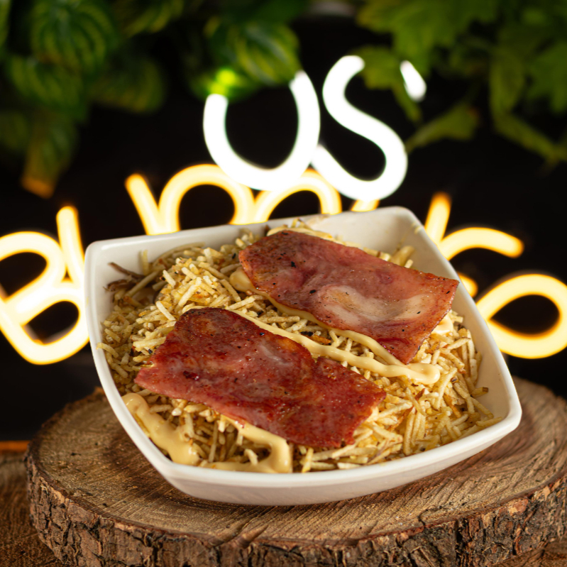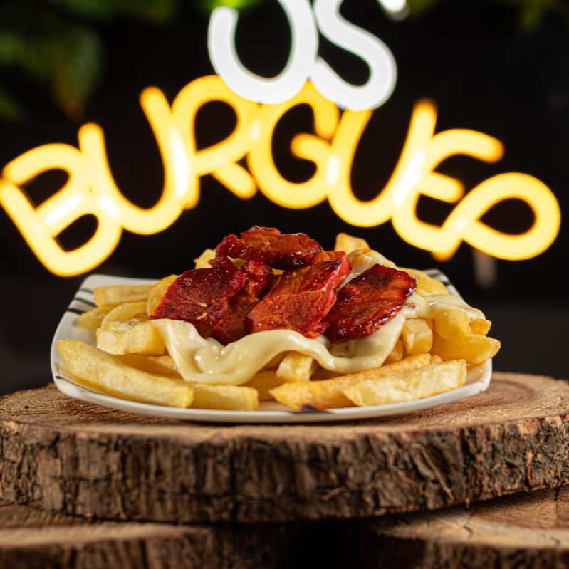 Papas a la francesa, salchicha, tocineta, costilla ahumada, cabano, chorizo, queso, cerdo y pollo 200 g, salsas.