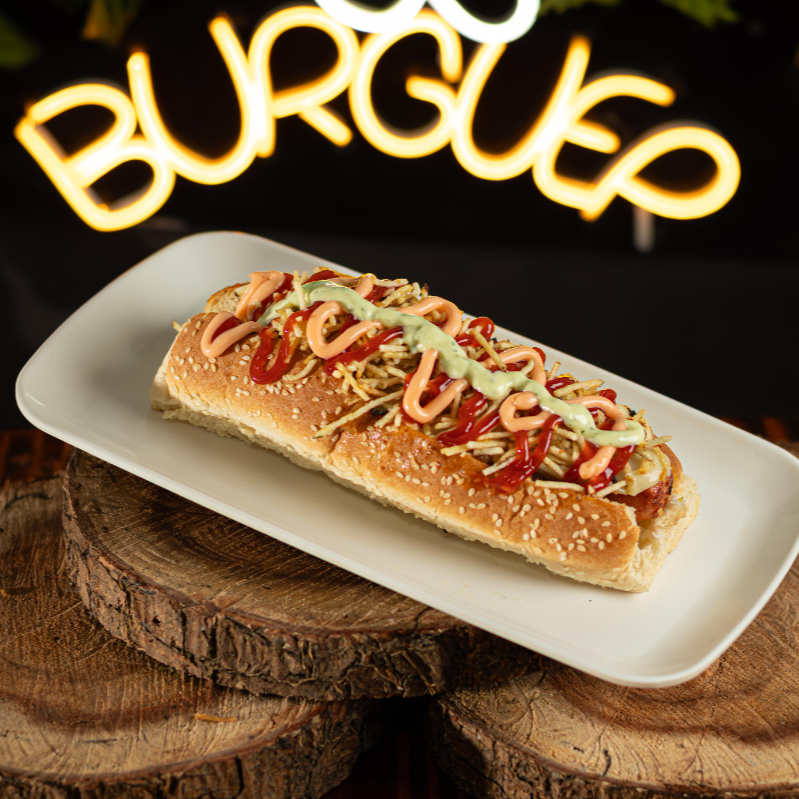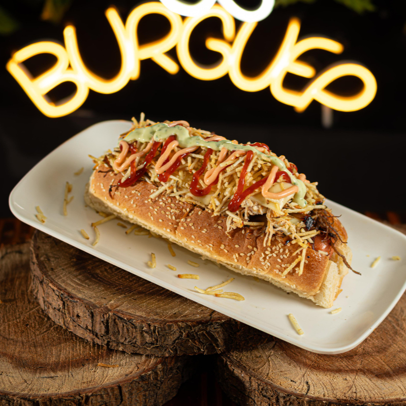 Pan Bimbo, salchicha americana, pollo desmechado en salsa, cebolla caramelizada, tocineta, queso, ripio de papa y salsas.