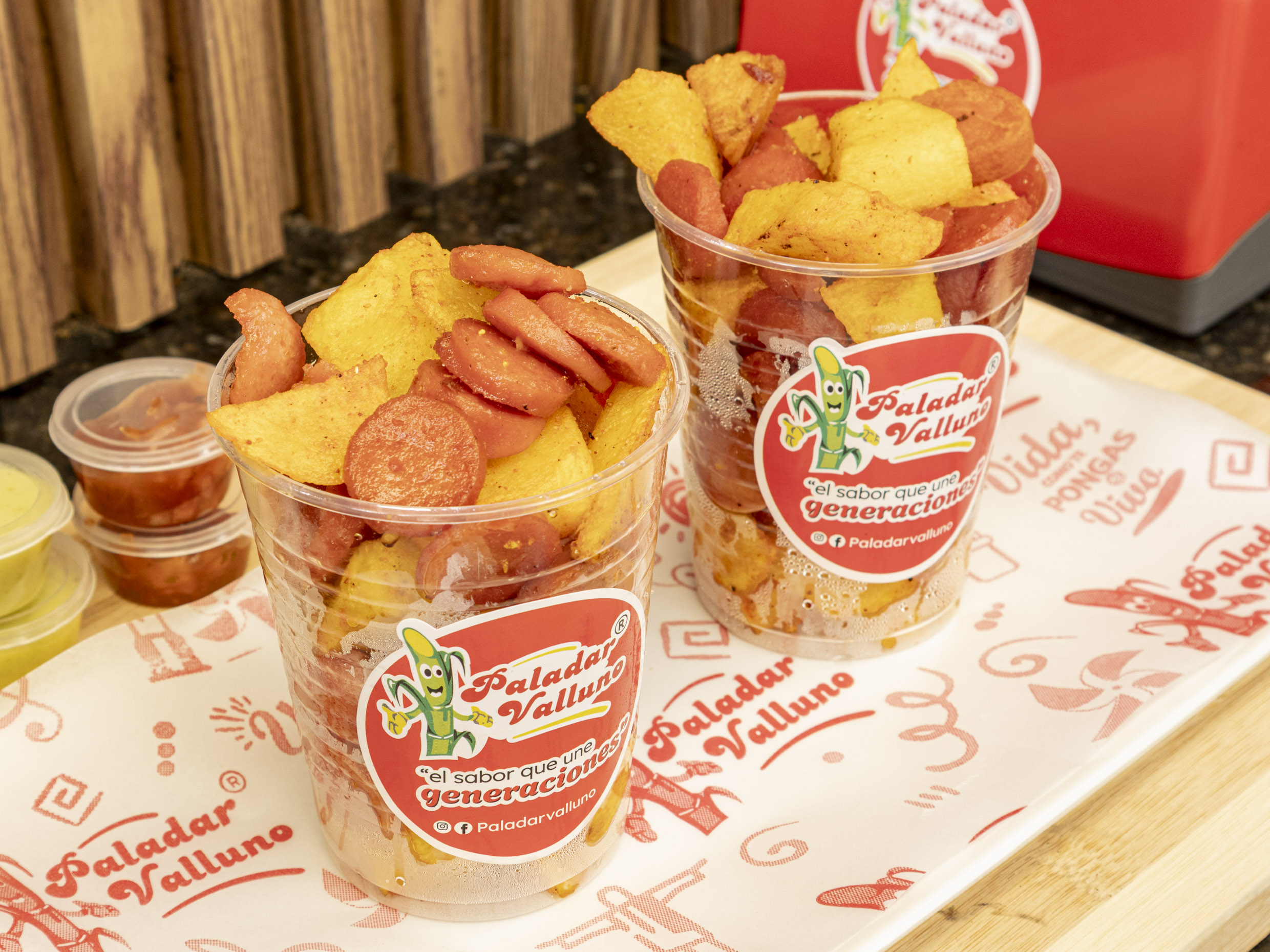 Vaso 10 oz transparente con salchicha en trocitos y papita criolla amarilla.