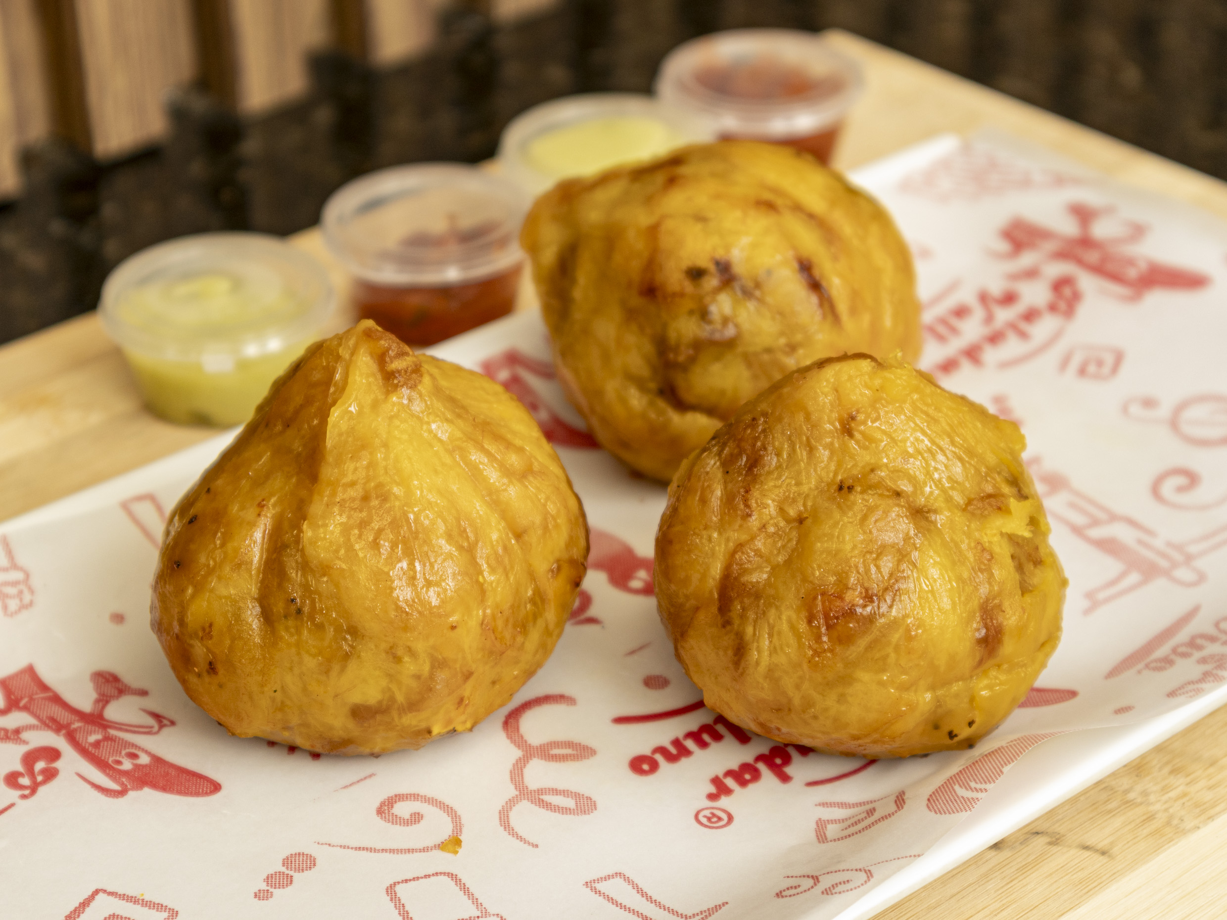 Papa rellena con carne desmechada arroz recubierta de una fina mezcla de harina de trigo y huevo.