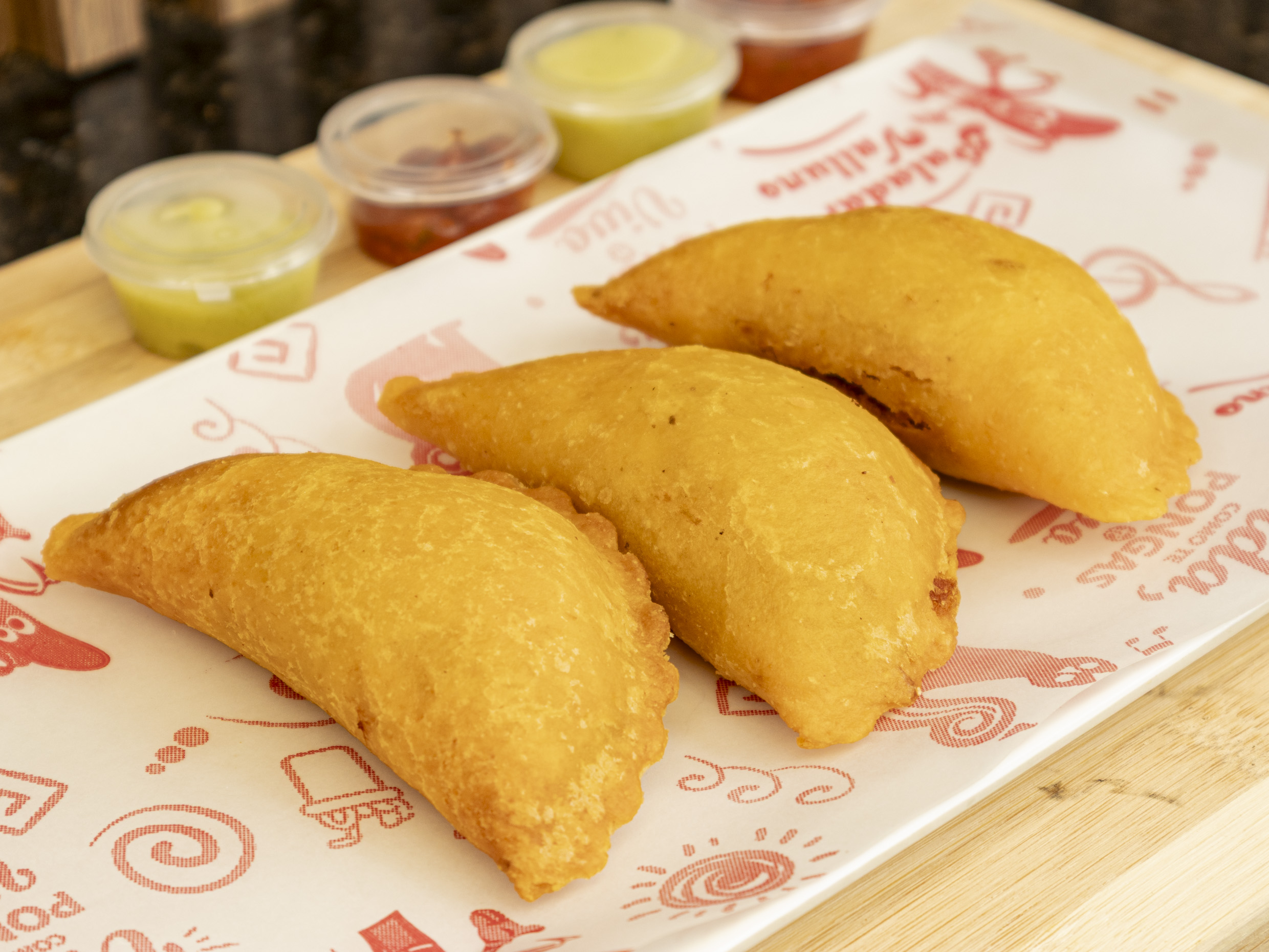 Unidad de empanada típica valluna rellena de guiso y carne de res.