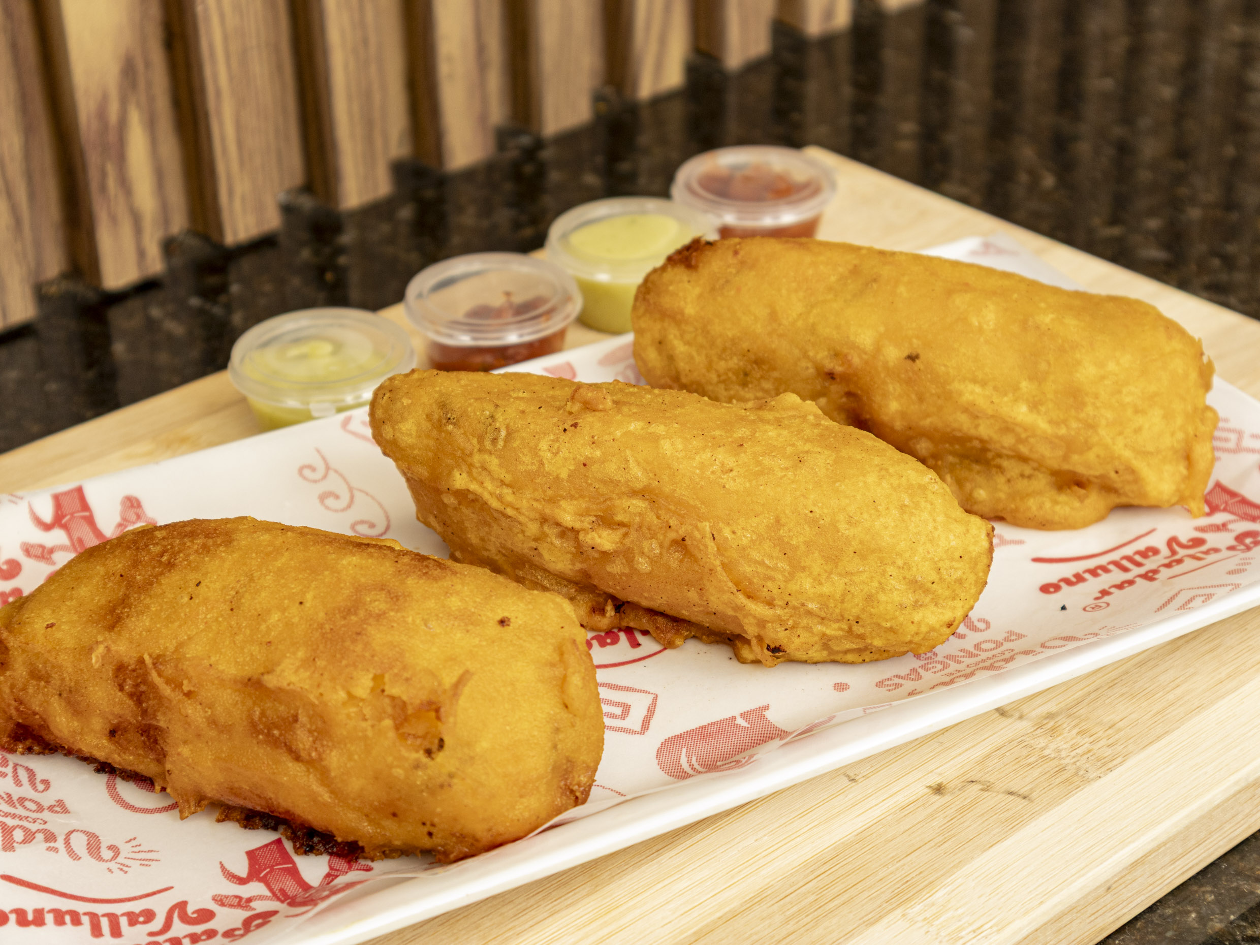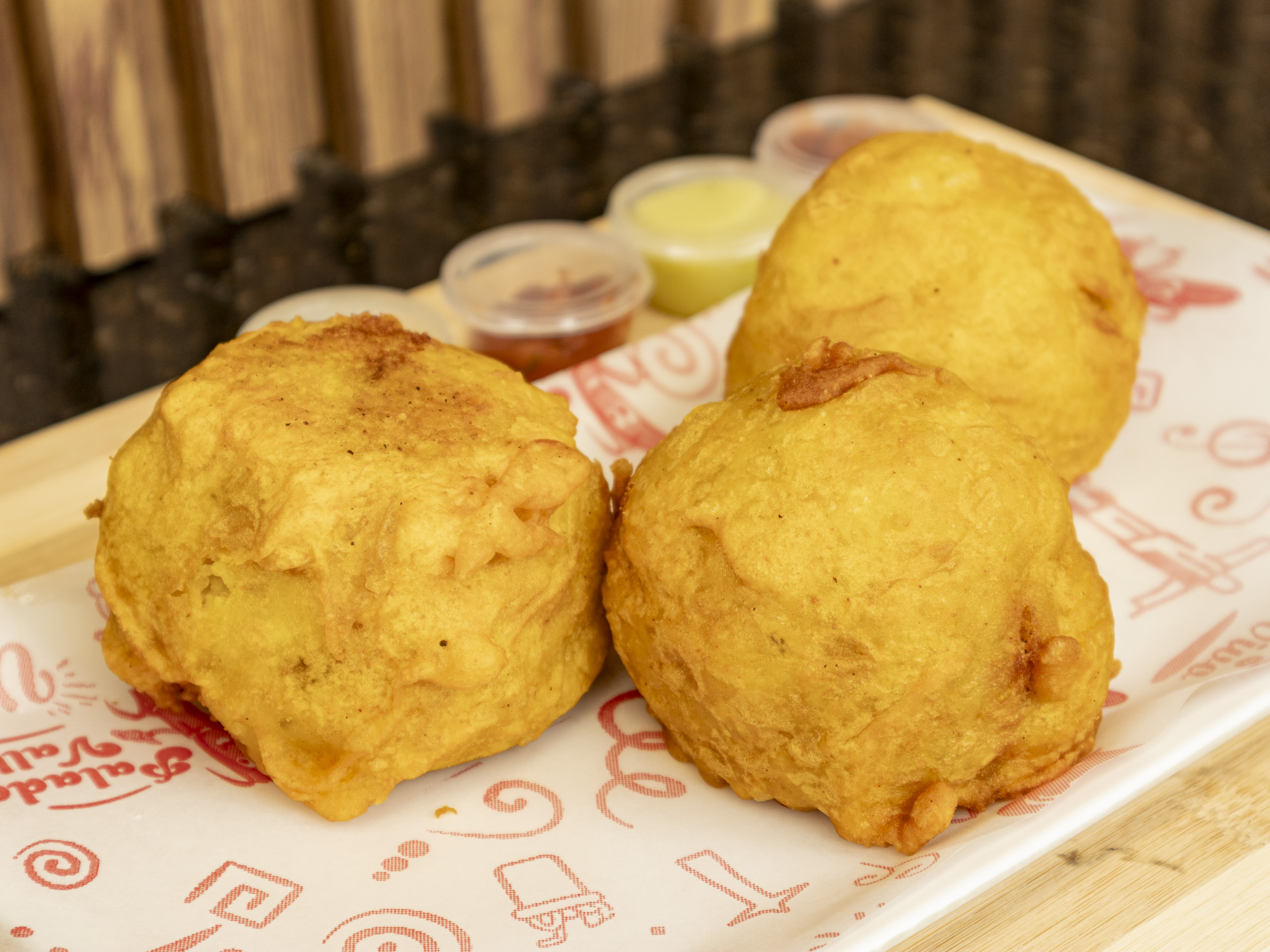 Maduro aborrajado acompañado con centro queso mozzarella recubierto de crocante mezcla de harina de trigo y huevo.