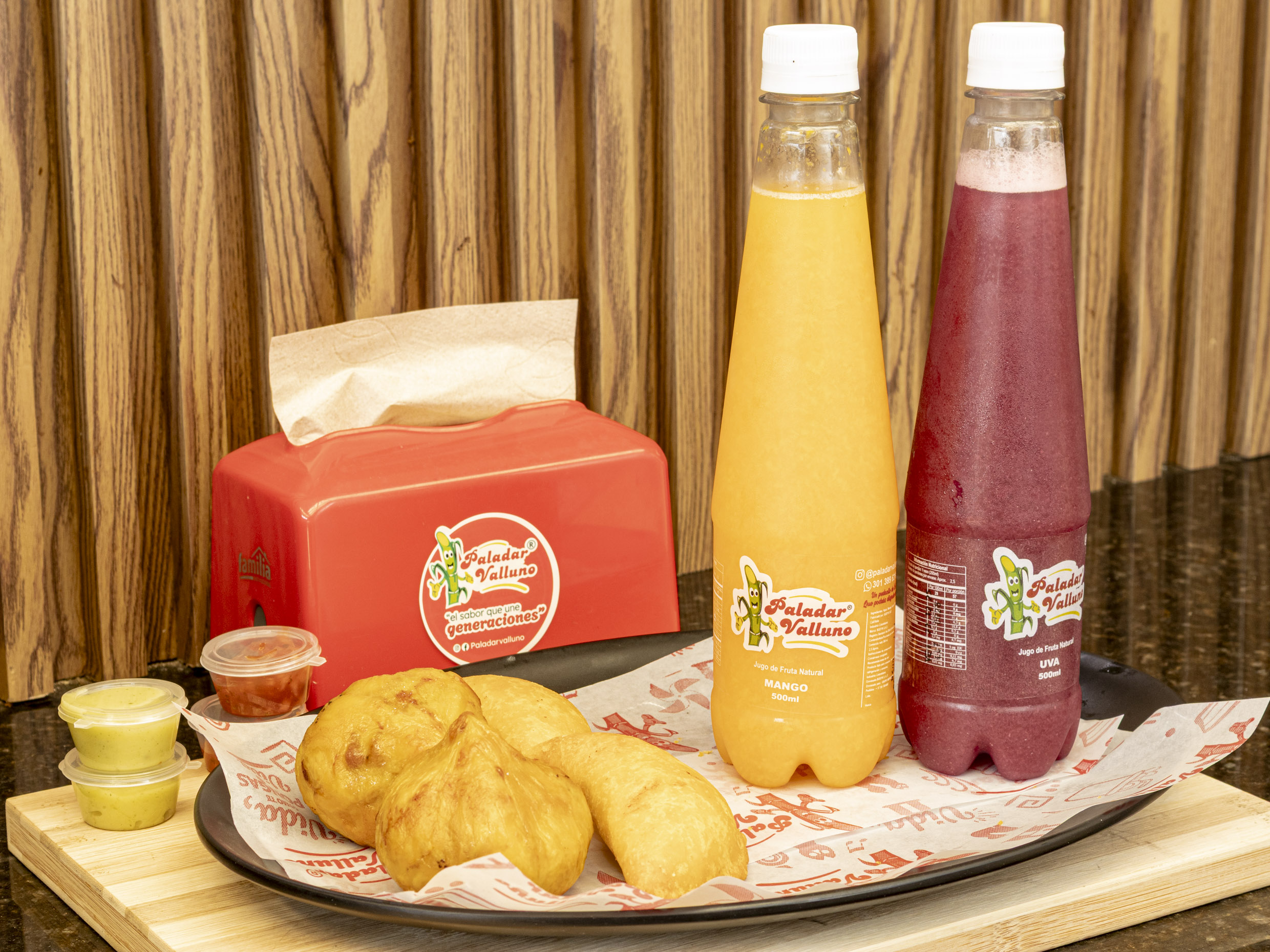 2 Empanadas, 2 marranitas, 2 jugos naturales 600 ml paladar valluno.