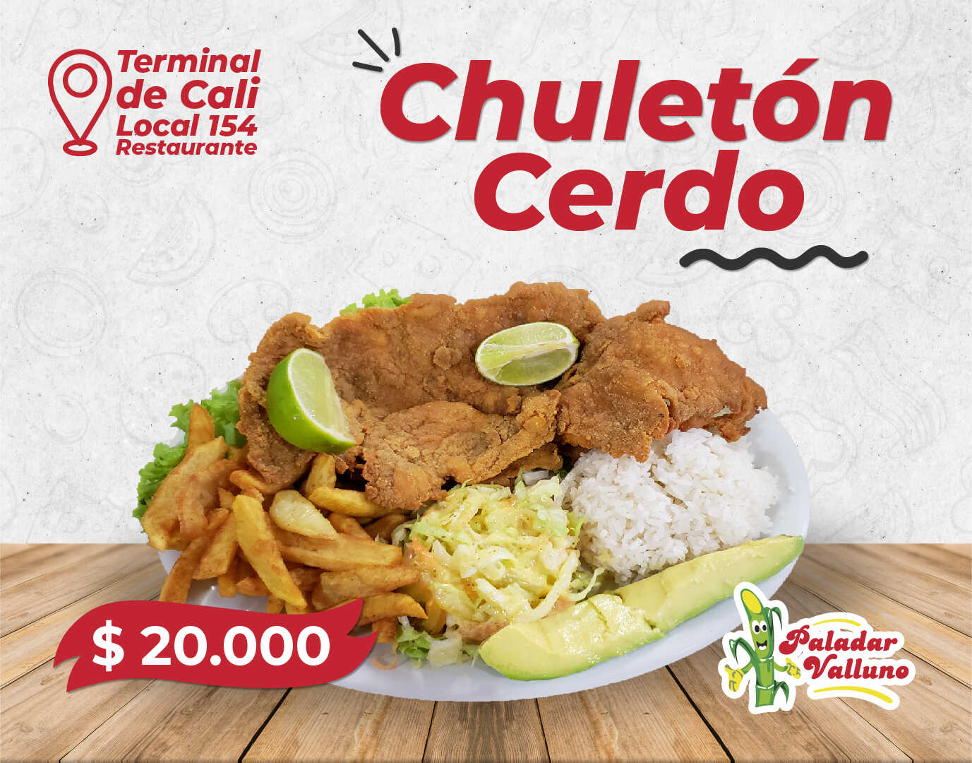 Acompañado de arroz, chicharrón, carne molida, huevo frito, chorizo, tostada plátano y ensalada de aguacate.