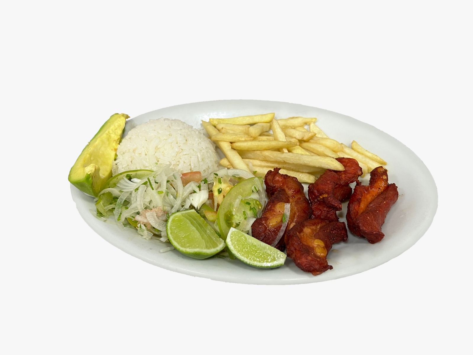 Acompañado de arroz, papa francesa y ensalada de aguacate.
