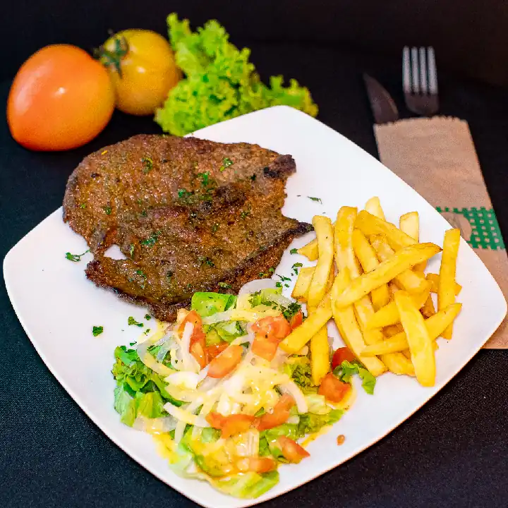 180 g De carne bola negra sazonada ensalada mixta (lechuga, tomate, cebolla y vinagreta de guacamole) salsa artesanal (salsa de ajo de la casa) y papas a la francesa más dos limonadas artesanales granizadas.